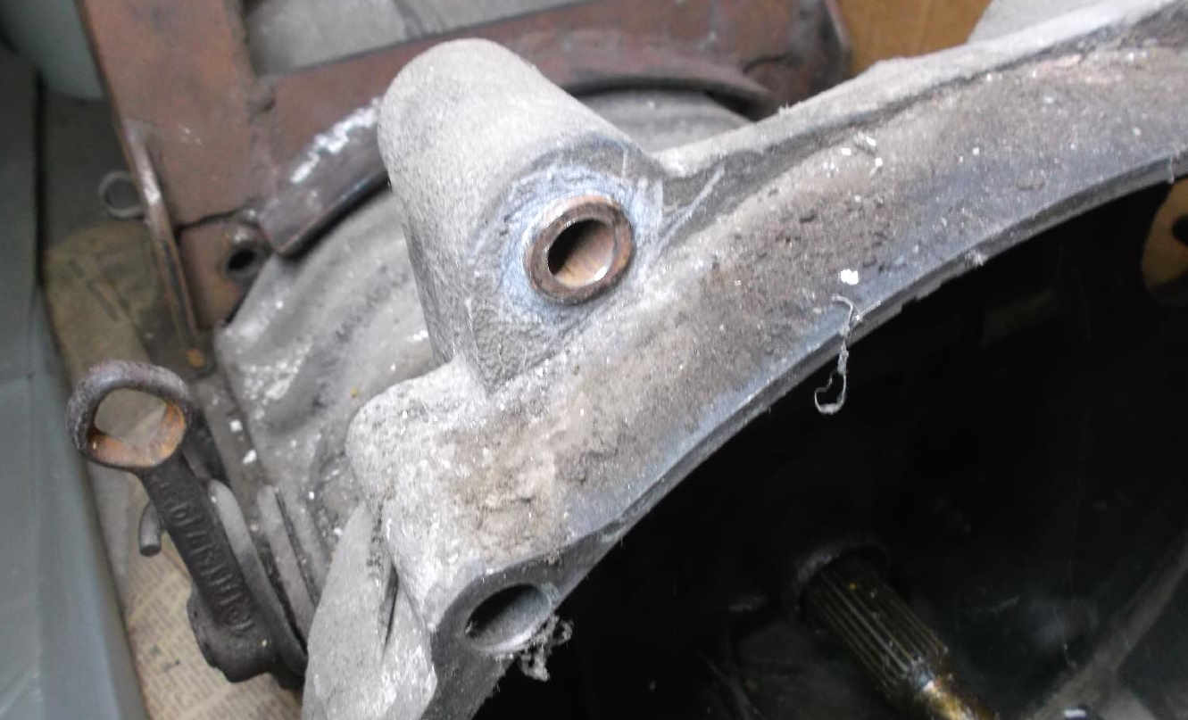 ( CE-Getriebe für einen 1600cc Motor.) Da ist offensichtlich eine durchgängige Stahlhülse eingesetzt, die sich auch nicht mehr mit viel Überredungskünste heraus nehmen lässt, also hoffnungslos festkorrodiert und in meinem Fall somit "unverlierbar" ist.