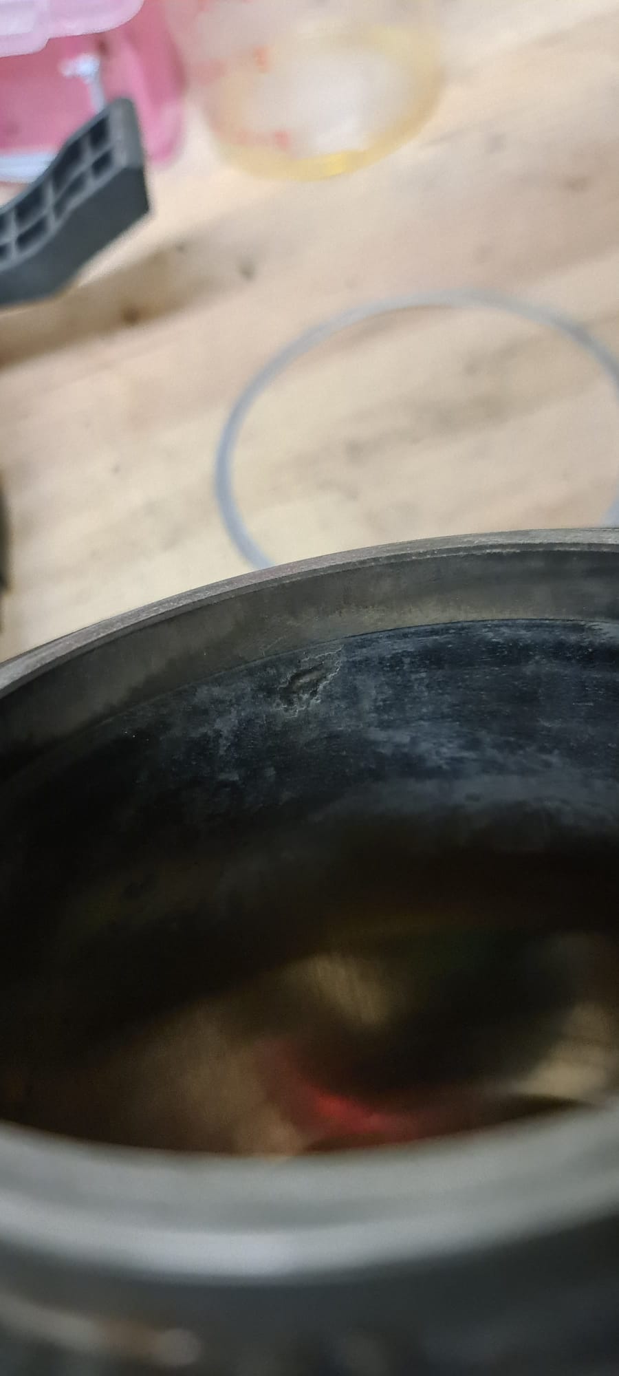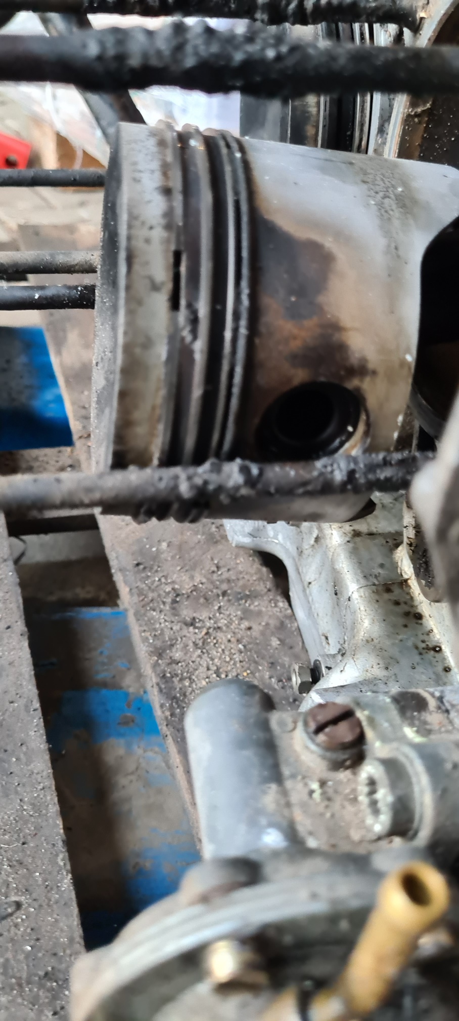 Fraglich sind die Kolben und Zylinder, die Ölabstreifringe sind total zugesetzt und an den Kolben erkennt man die Bereiche in denen vorbeigebrannt ist, ansonsten sind die Kolben super, die Zylinder haben leider leichte Narben durch die Standzeit, jedoch ist sogar noch der Hohnschliff zu erkennen.