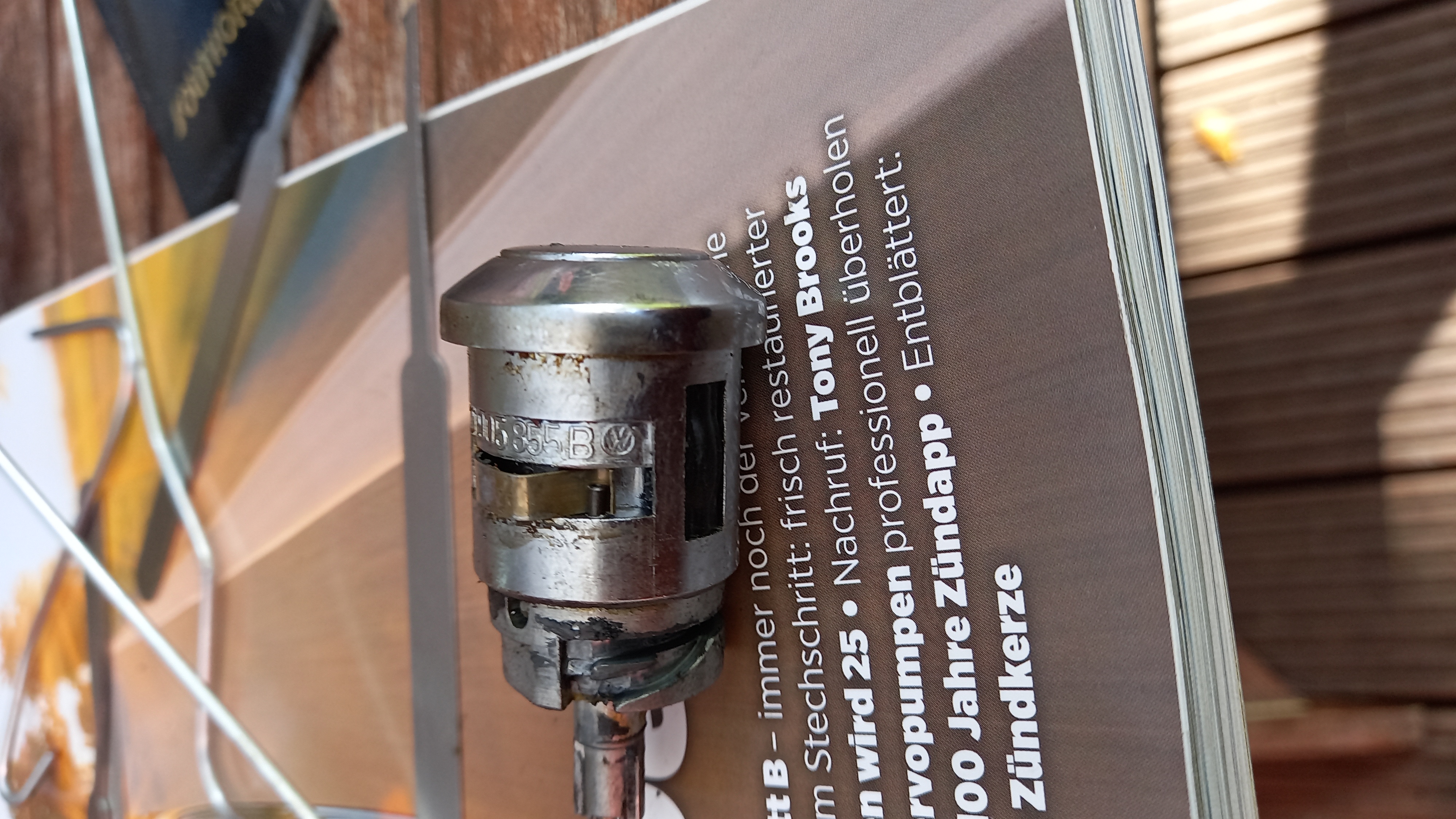Auf dem letzten Treffen habe ich für kleines Geld ein komplettes Zündschloss mit Gehäuse geschossen, mit dem schönen alten Schloss mit Chromrand.