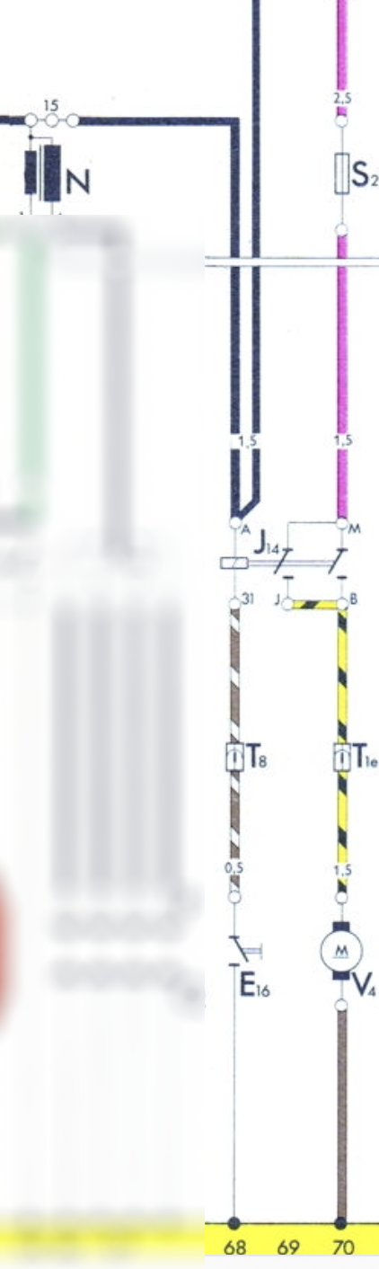 - das braun weiße Kabel kommt von vorne vom Heizungshebel E16 (fast nach unten gezogen geht das Gebläse erst an)