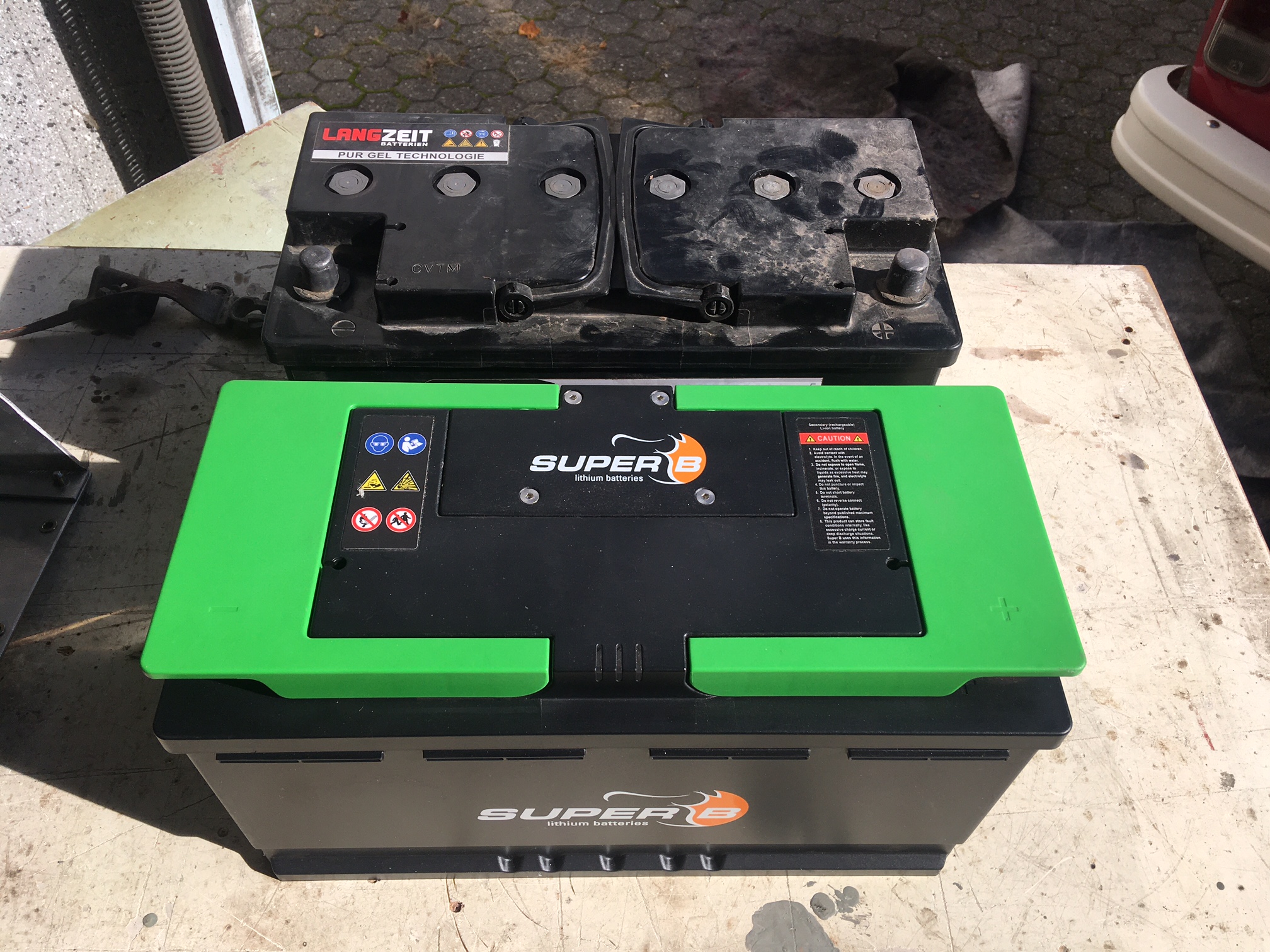 Hier ein Vergleich der 100Ah Gel-Batterie vs. die 90Ah Lipo (26,5kg vs. 12,5kg):