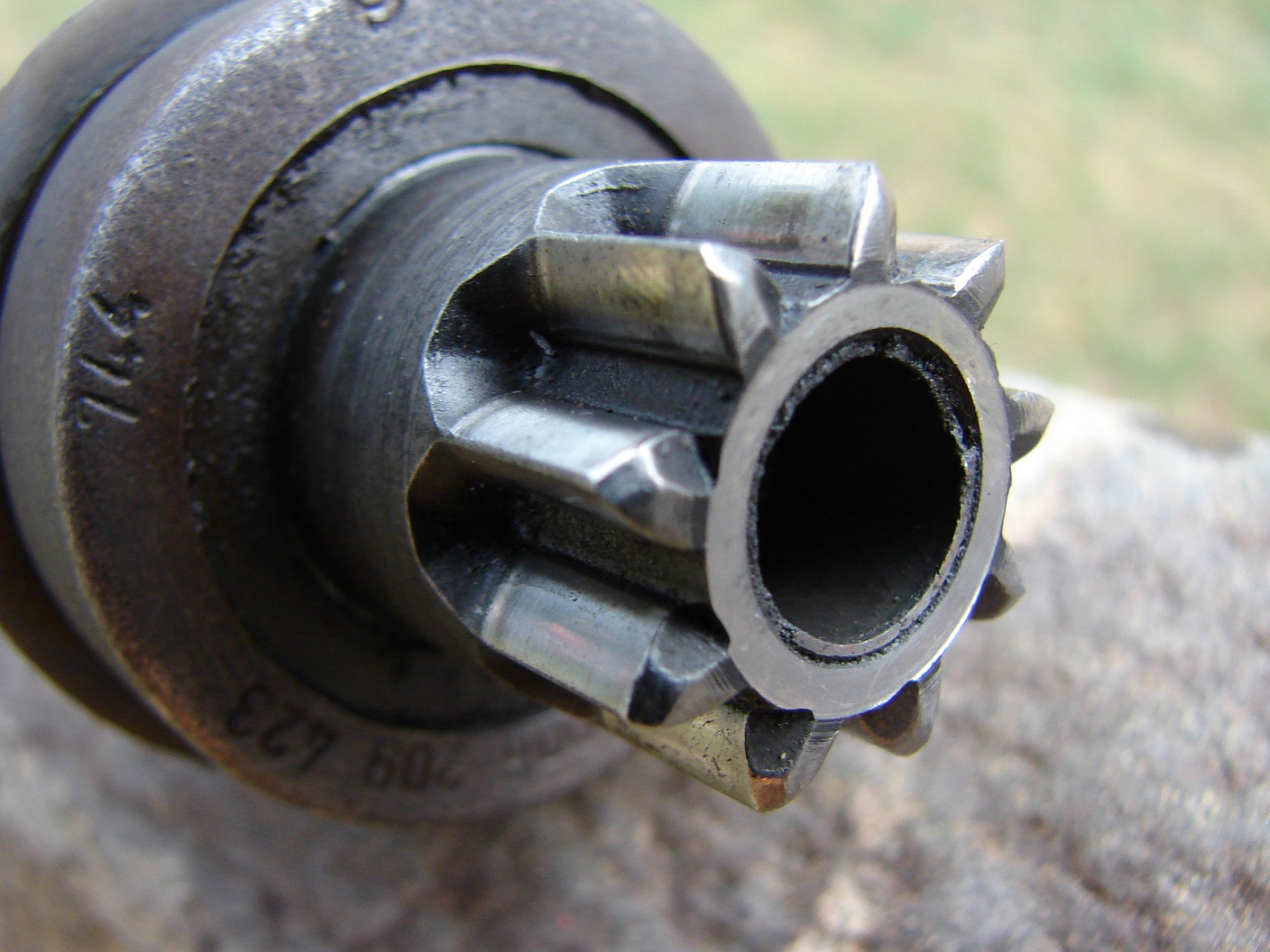 Meine (zu?) simple Diagnose war "Ok, Freilauf im Eimer! Wie schön, dass Du seit 30 Jahren einen Reserve-Freilauf spazieren fährst". Also Anlasser ausgebaut und Freilauf gewechselt. Beide Freiläufe schienen sich äußerlich gleich zu benehmen: in der einen Richtung blockierend, in der anderen frei durchdrehend.