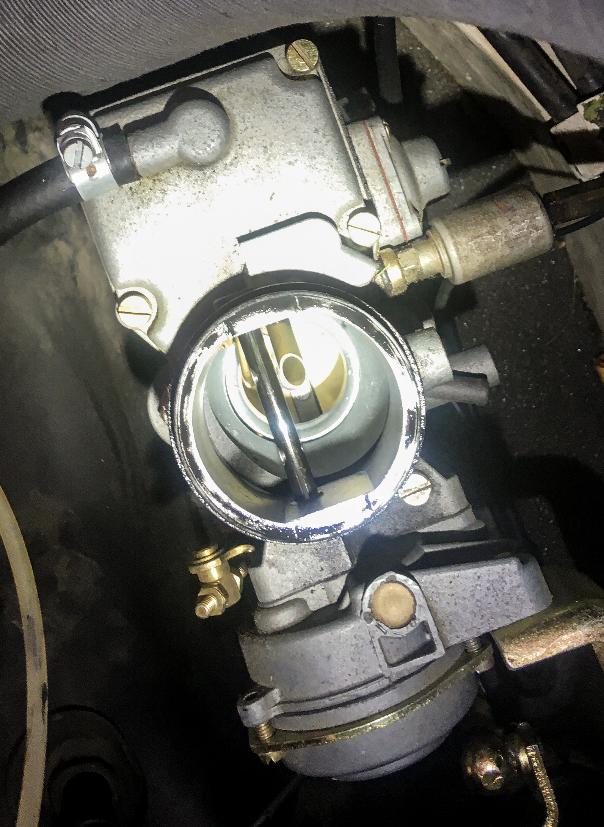 Am nächsten Abend dann Ventilspiel gecheckt, um sicherzugehen, dass er mechanisch nichts abbekommen hat, aber alles ok. Neue Zündkerzen spendiert, die Zündkabel durchgemessen und den K&N-Luftfilter gereinigt. Dabei musste ich ja das Ansauggeraffel abnehmen und das Problem wurde offensichtlich (links unten): Die Vergaserdeckeldichtung wurde am rechten Vergaser immer weiter nach innen gezogen und hat dort irgendwann die Starterklappe blockiert (lief wohl am Ende viel zu fett) und zusätzlich entstand noch ein Spalt, durch den Luft ohne Luftfilter-Widerstand eintreten konnte. Die Dichtung hab ich gleich getauscht, aber trotzdem noch Bedenken gehabt, ob die Abstimmung jetzt noch passt (Zündung und Synchronisierung hatte ich gecheckt). Bei der Firma Kummetat (was immerhin 500km entfernt ist), gab es kurzfristig keinen Termin für einen Check-up, daher habe ich mich in der Umgebung umgesehen und bin via Instagram bei Richarzzz Speedshop http://www.richarzzz-speedshop.de/ (oder https://www.instagram.com/richarzzzspeedshop/) in Backnang bei Stuttgart gelandet. Der Eigentümer Jens ist super-sympatisch, äußerst kompetent und hat sich bereit erklärt, mal draufzuschauen. Er hat eine tolle Werkstatt, zahlreiche wunderschöne Kundenfahrzeuge und sehr nette Typ1- und Typ4-Motoren im Aufbau. Er hat der CSP-Python erstmal eine Lambda-Sonden-Muffe verpasst und wir sind dann mit Breitbandlambdasonde auf Testfahrt gegangen (Termin für Rollenprüfstand war viel zu kurzfristig). Resultat: Trotz der recht hohen Laufleistung und meinem nicht ganz langsamen Fahrstil war er vom Motor sehr angetan, die Abstimmung gemischtechnisch perfekt und ich war super erleichtert. Kann die Werkstatt für alle in der Umgebung von Stuttgart unbedingt empfehlen - Problem ist wohl nur, einen Termin zu finden