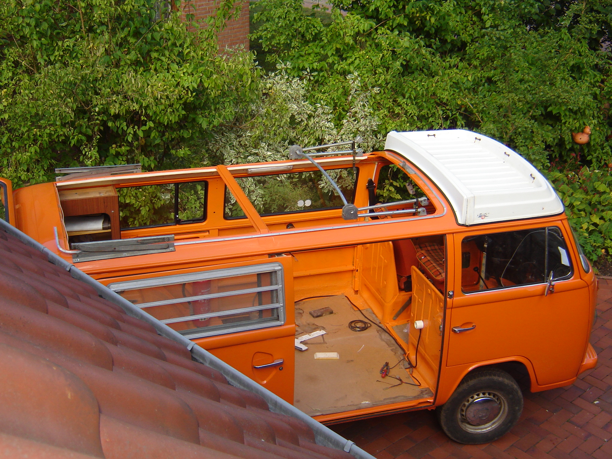 Mein Bus (78er Westfalia Berlin) mit Aufsatzdach und Pilzdach soll auf ein großes Aufstelldach umgerüstet werden. Ich habe also bereits einen Dachausschnitt für das Hubdach.