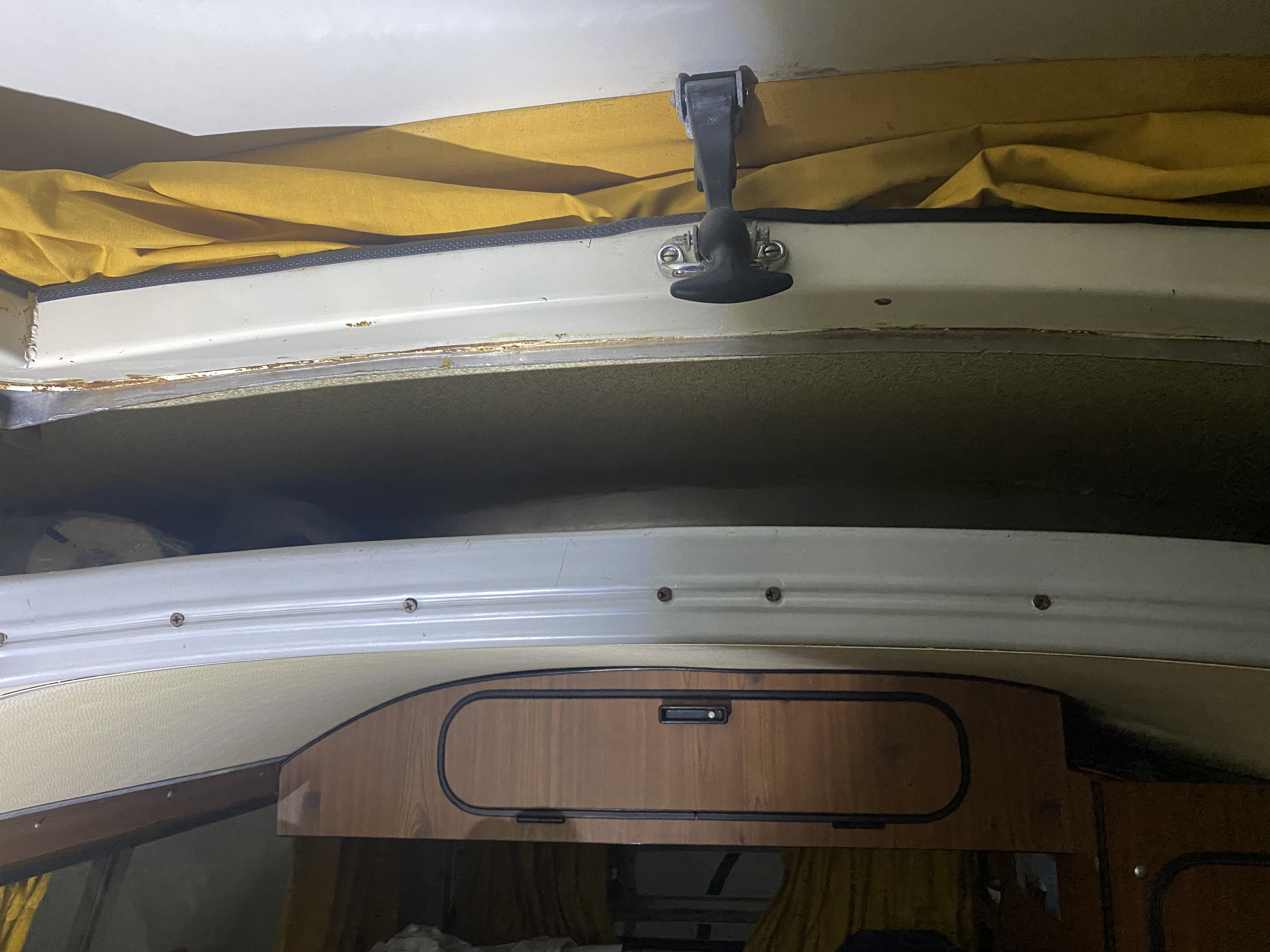 Sieht man auf dem Foto recht gut… da sieht man auch die ungefähren Positionen der Scharniere und man sieht auch eine der Aluleisten, welche dir vermutlich auch fehlen, mit der der Zeltstoff auf die Dachhaut geschraubt wird… da ist mir nur der Hersteller bekannt -> https://nlavw.com/home/428-westfalia-ea ... -trim.html