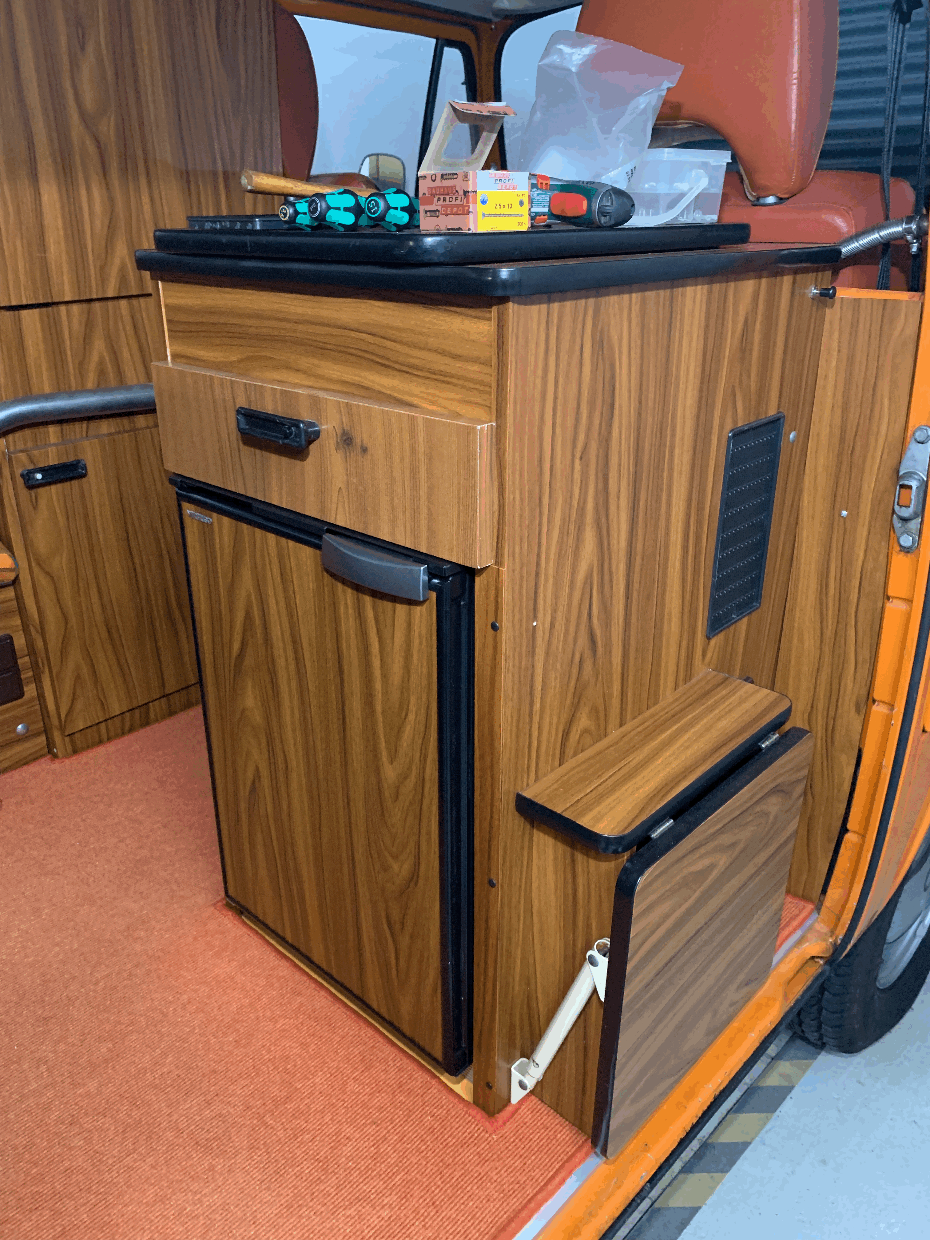 Der Originalkühlschrank konnte immer mit Gas betrieben werden (ich denke es war der von der Marke Kreft). Die Option mit Gas finde ich immer super, da wir mit dem Bus auch oft Wildcampen und dann keinen Zugang zu Strom haben.