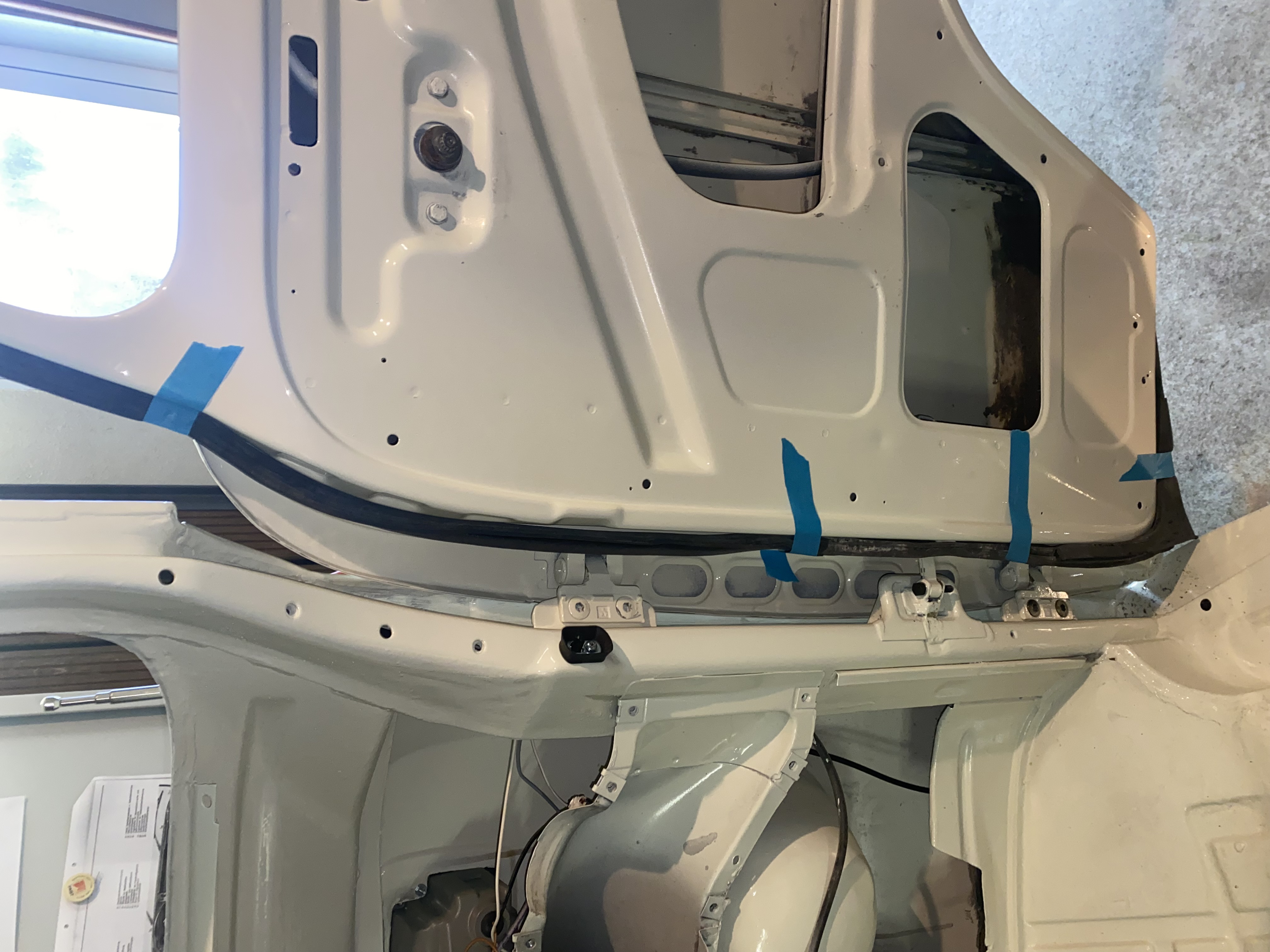 Ich habe mich natürlich auch am Fangband orientiert, das ist ja selbsterklärend… Auch der sonstige Verlauf ist ja eindeutig, nur vorne könnte sie weiter an der Pfalz entlang laufen, macht eigentlich keinen Sinn aber dann müsste sie länger sein. Aber dass die Dichtung so viel zu lang ist, ist ja auch kaum zu glauben. An der linken Tür kann ich mich nicht orientieren, weil die gerade auch keine Dichtung hat, das Auto war ziemlich zerlegt und ausgerechnet davon gibt‘s keine Bilder