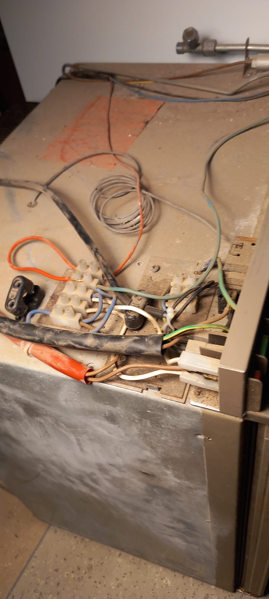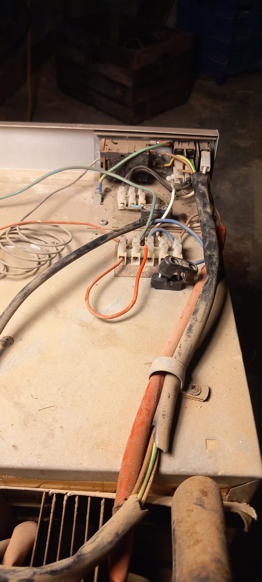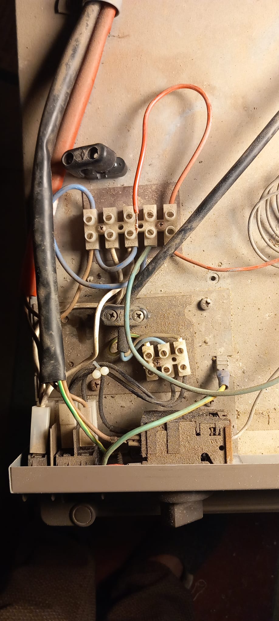 Also sind die oberen 5 Anschlüsse für 12V Betrieb. Die schwarze offene Zugentlastung zeigt ebenfalls, dass hier ein Kabel angeschlossen wird. Ich sehe 2 weiße Kabel, die wohl zu dem (beleuchteten?) 12V Schalter gehen und 2 braune Kabel die zu der 12V Heizpatrone gehen.