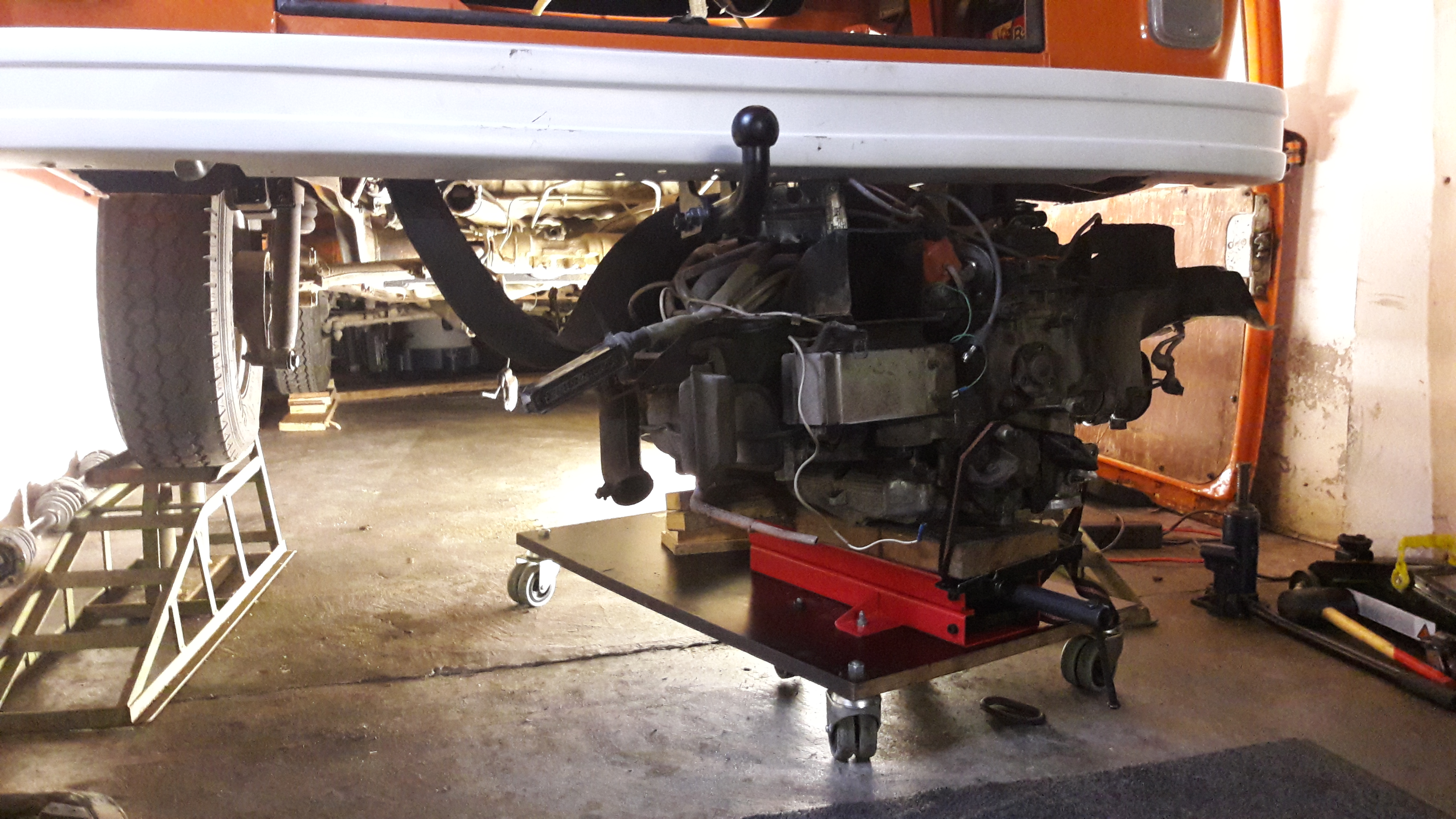 Den Bus muss man zum raus ziehen des Motors auf dem Rollbrett immer noch mal mit dem Rangeierwagenheber hoch pumpen, damit der unter der Stoßstange lang passt.