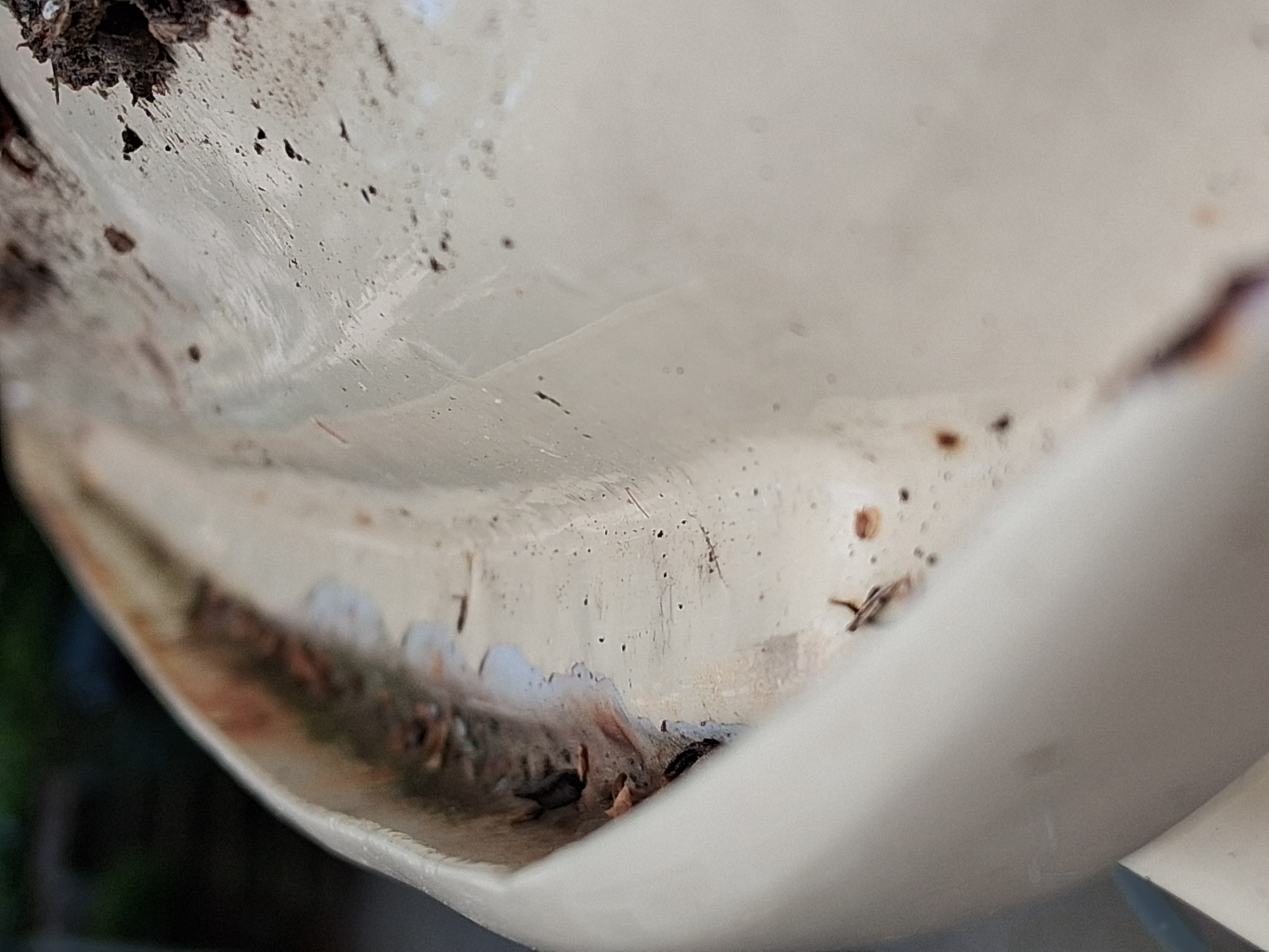 Man muss sich darüber bewusst sein, dass an dieser Stelle drei Blechpartien aufeinander treffen. Rost auf der Rinne bzw. Im Wasserlauf kommt häufig von innen und muss auch dort behandelt werden.