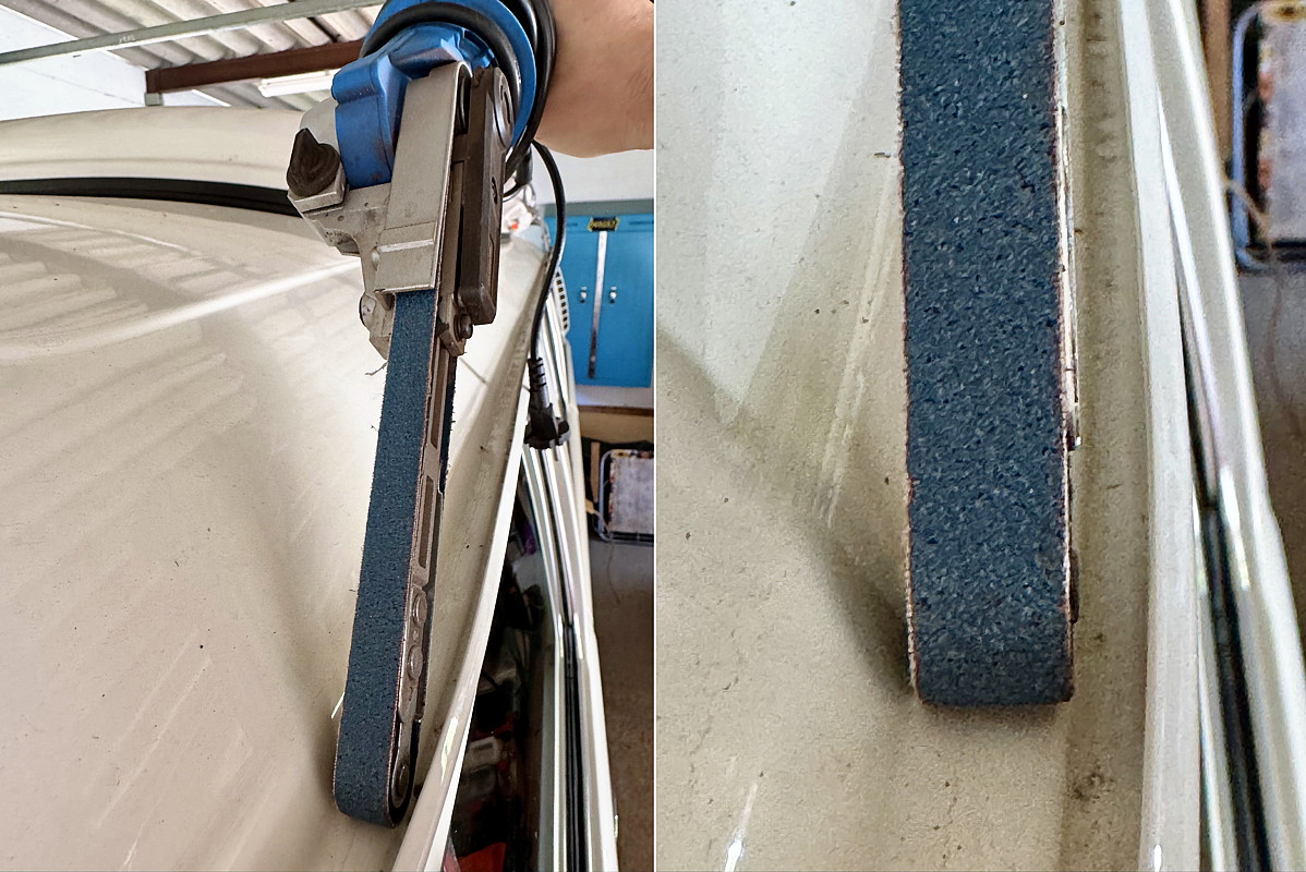 Ich würde den zusätzlichen abplatzenden Altlack entfernen, manches kannst Du mit einer 13mm breiten Elektrobandfeile (mit 230V so um 40 €, siehe Bild unten - oder per Akku oder Druckluft) schneller schleifen, vieles in den Ecken und Fugen eher nur von Hand ggf. mit kleinem passend vorbereitetem Holzbrettchen als Schleifblock (ein Dremel wäre zwar auch punktuell und in den Fahrzeugecken eine Hilfe, aber braucht für die Fläche lange), danach gut säubern und von Fetten befreien, dann Rost-Passivierung (manche nehmen Fertan o.ä. ich bevorzuge immer noch POR15 METAL-PREP mit Zinkphosphat zum Aufrauen/Phosphatieren von blankem Metall und von verbliebenen kleinen Rost-Ecken wandeln von Eisenoxid zu Eisenphosphat), ausspülen mit Wasser und trocknen lassen, danach 2x POR15 Rostschutzlack, gut durchtrocknen lassen, leicht fein anschleifen für Decklack, 2K Decklack z.B. per Spraydose oder Pinsel.