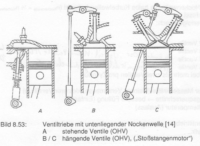 Die Bezeichnung beschreibt die relative Einbauposition zum Kolben, siehe Bild (Quelle: MTZ). Hängende Ventile sind im Pkw Bereich die häufigste Form. Stehende sind eher selten, da zwar günstiger zu realisieren, aber mit einigen Nachteilen behaftet. Der VW Boxer kommt der B-Variante am nächsten.