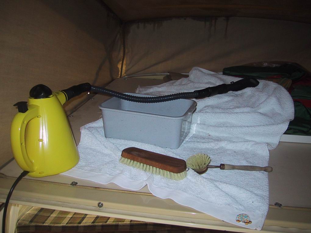 Zum Einen habe ich auch Waschmittel mit in dem Essigwasser gehabt. Da sich das nicht ausspülen läßt ist derzeit mein Himmel ein ganz klein wenig "backig", mal sehen, ob das noch durchtrocknet und sich dann wieder ausbürsten läßt. Zum anderen sollte man Folgendes bedenken: Letztendlich verreibt man die Schimmelpilzsporen nur in der Beflockung. Der Dampfreiniger saugt die ja nicht ab, er löst sie nur. Durch das nachfolgende Schrubben verteilt man dann die Sporen in der Beflockung, "weg" sind sie damit nicht.