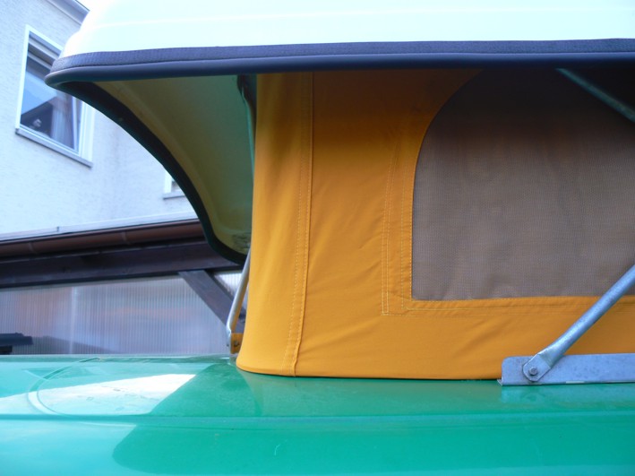 Da mir aber die umlaufende Abdeckung auf der Innenseite fehlt, ist mir bei Schlagregen das Wasser immer an der Zeltbahn herunter in den Ausschnitt gelaufen. Die größeren Dächer haben eine Aluprofil-Kante, die den Stoff auf der Oberseite des Blechdaches fixiert.