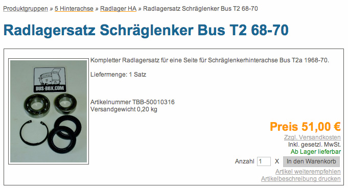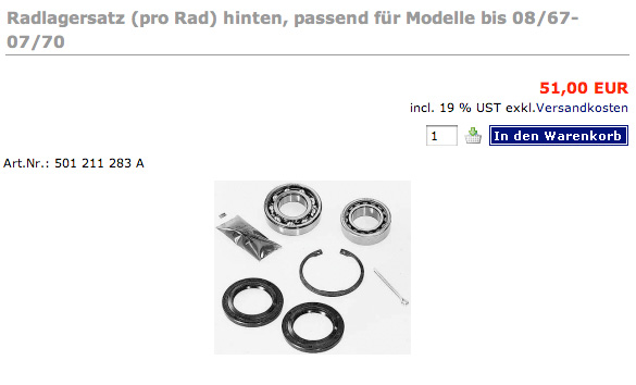 Jedenfalls hab ich den Lagersatz weggeschmissen, ein großes original Wälzlager NAG mit Messingkäfig im Internet geordert (für stolze 84 Euronen..., man gönnt sich ja sonst nix) und ein SKF Rillenkugellager beim lokalen Lagerhändler geholt und das ganze montieren lassen. Nach rund 100 km war das Zirpen wieder da, und beim ersten schnelleren Ritt kam ein typisches Radlagerbrummen ab 60 kmh (besonders in Rechtskurven dazu). Die Werkstattmenschen meinen jetzt, dass die innere Abstandshülse nicht zu dem Lager passen würde, möglicherweise hätte auch das Lager leicht abweichende Abmessungen und ich müsste unbedingt original VW Lager organisieren.