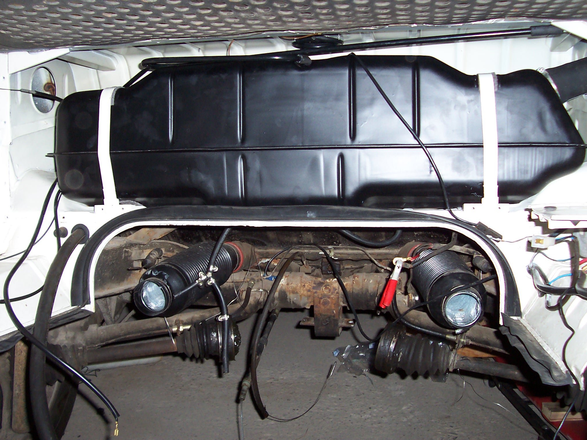 Verkabelung: graues Kabel mit dem Kabelschuh gehört an die Anschlussfahne, das braune Kabel unter eine Schraube des Tankgebers und das andere Ende mit einer Blechschraube in den Querträger oben. Das graue Kabel (im schwarzen Schlauch drin) ist einfach unter die Tanktrennwand geklemmt und im Motorraum am Steckverbinder angeschlossen (liegt im Bild auf der Motorraumdichtung auf). Vom Steckverbinder aus geht das Kabel weiter zur Tankanzeige im Armaturenbrett - d.h. bevor du alles zumachst, mal kurz testen.