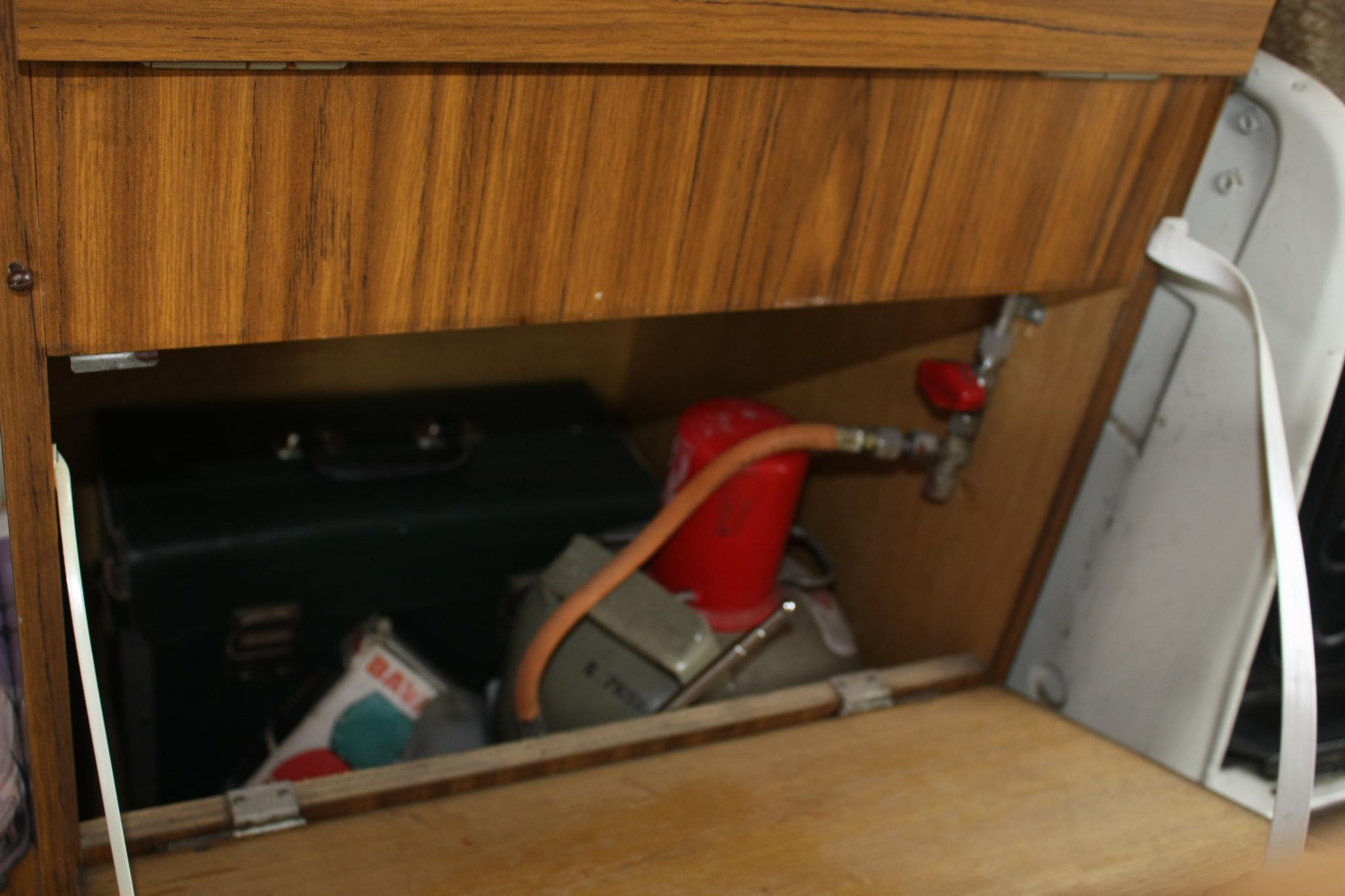 Gasflasche in der unteren Schranktüre. Wird durch einen Plastikvorhang (nicht zu sehen) an die Kleiderkammer abgetrennt. Die Gasflasche befestigt mit 2 Zurrösen und nem Gummiband. In meinem Fall nur ein Verbraucher: Der Herd.
