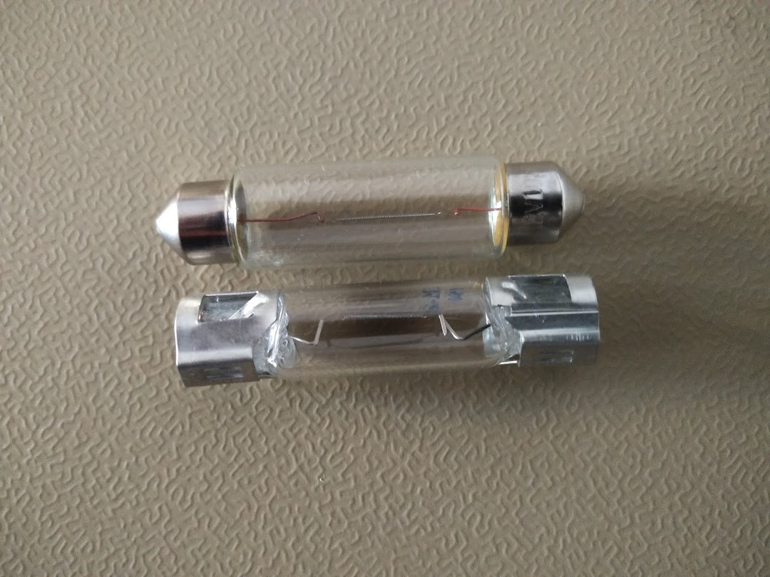 Verwendet werden übrigens amerikanische "211-2" Glühbirnen mit 12V 10W (unten), die nicht 100% kompatibel mit den hiesigen "Soffitte" Glühbirnen sind (oben). Die EU-Glühbirnen sind leider zu "fett" und lang und passen nicht wirklich gut in die Fassung