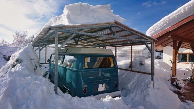 Nachdem Regen angesagt wurde, hab ich die eh schon schwere Masse an Schnee mal zum großen Teil vom Unterstand geschaufelt.