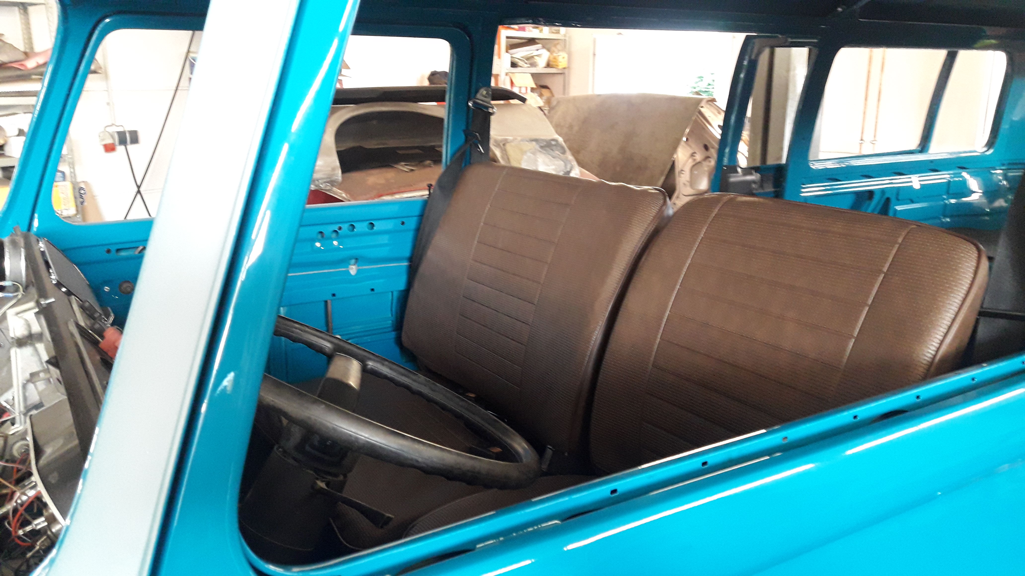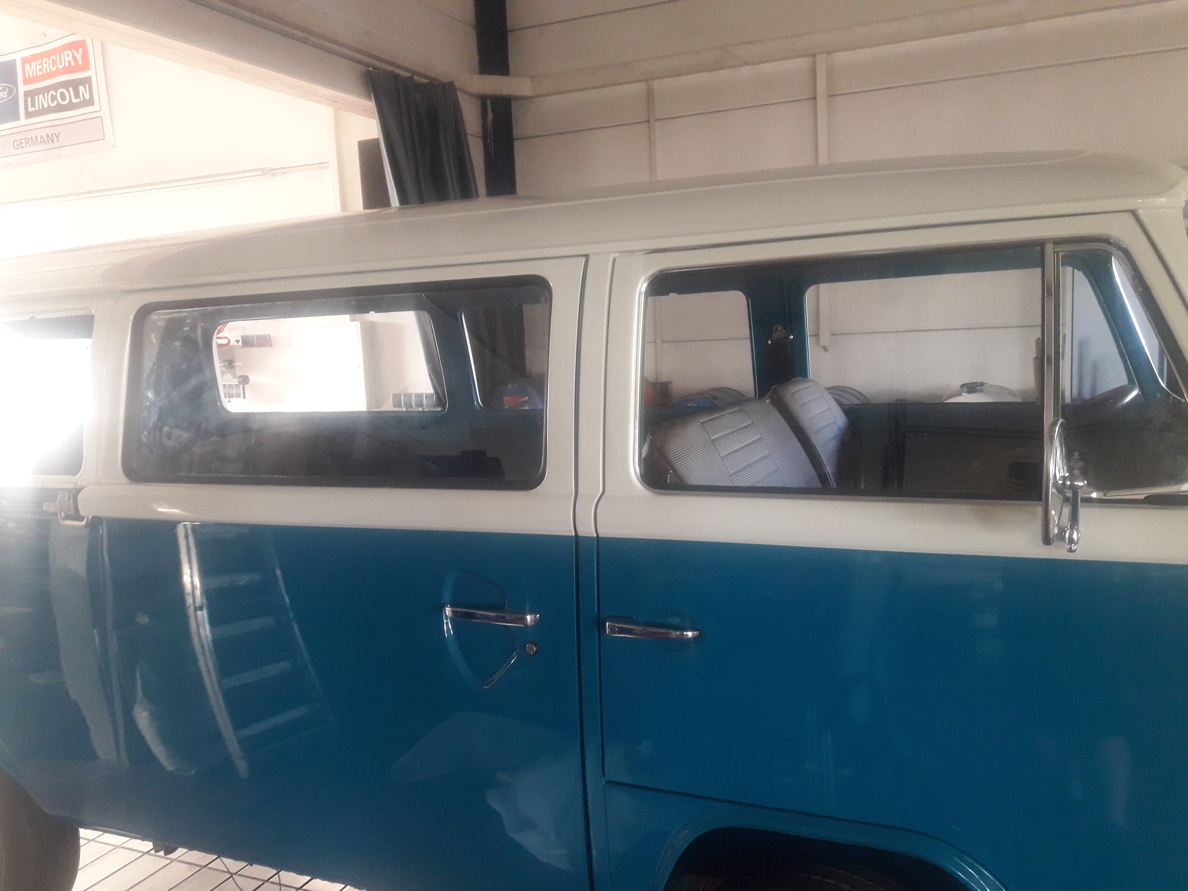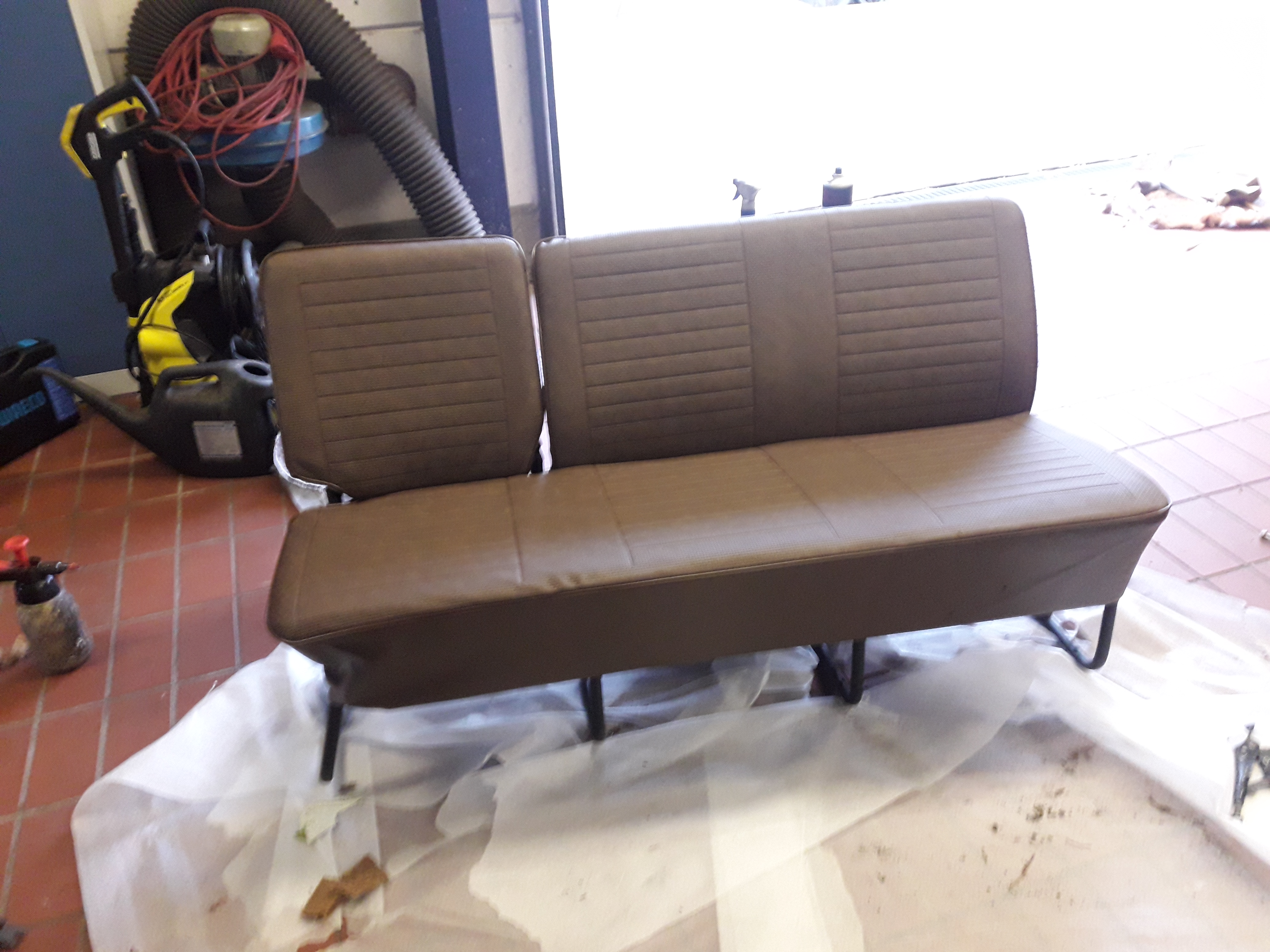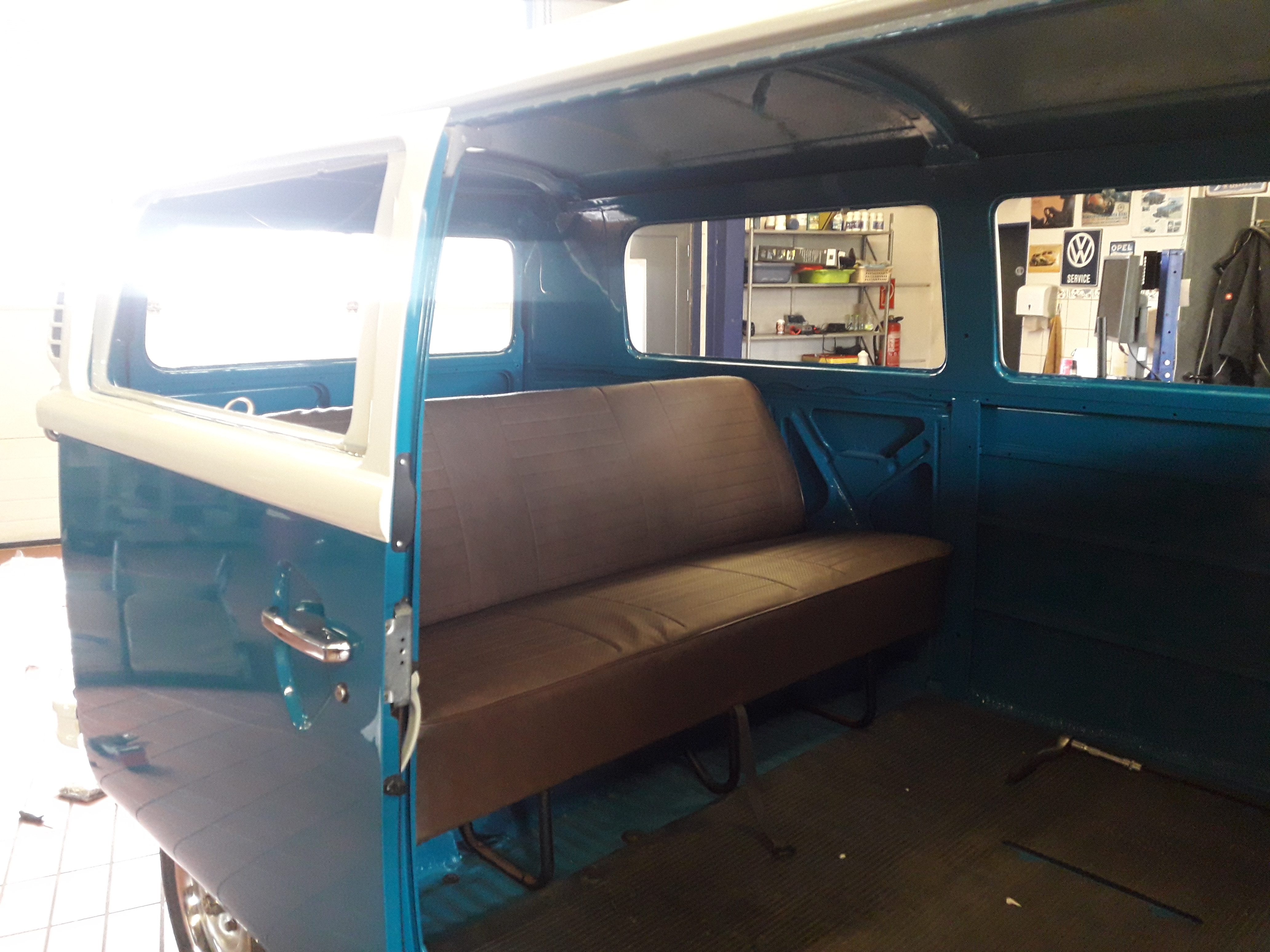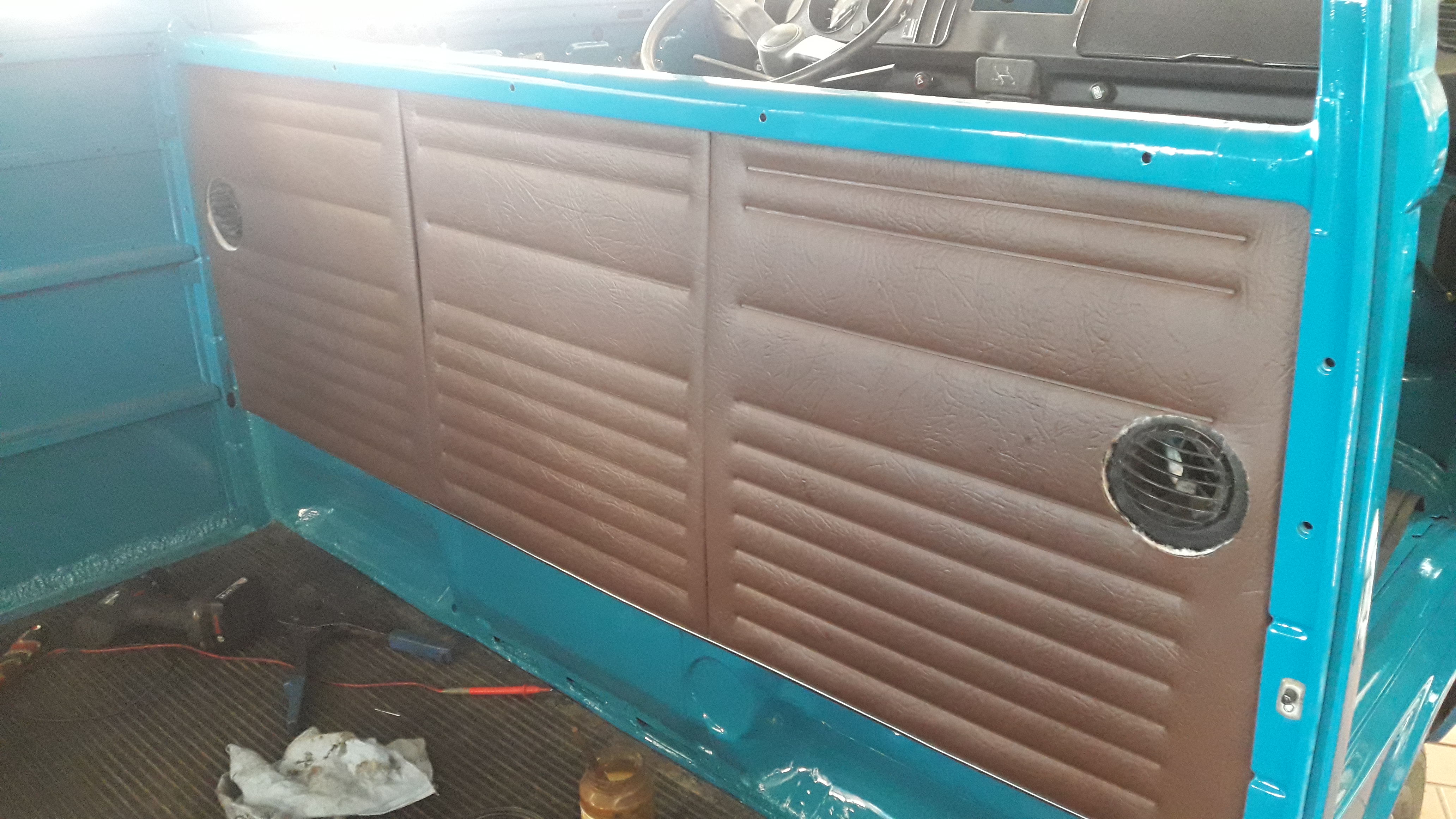 Dieses Wochenende wird noch ein wenig gebastel und Montag falls das Wetter passt, geht er dann zum Sattler den Himmel einbauen lassen. Heckscheibe und Schiebetür Scheiben sind schon mal drin. Die Sitzbänke haben wir dann auch begonnen zu überziehen und die Sitzpolster zu ersetzen