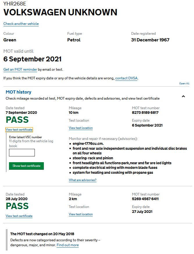 Das Fahrzeug ist in England registriert und war da auch am 6. September bei der MOT. mit einem km Stand von 10km.