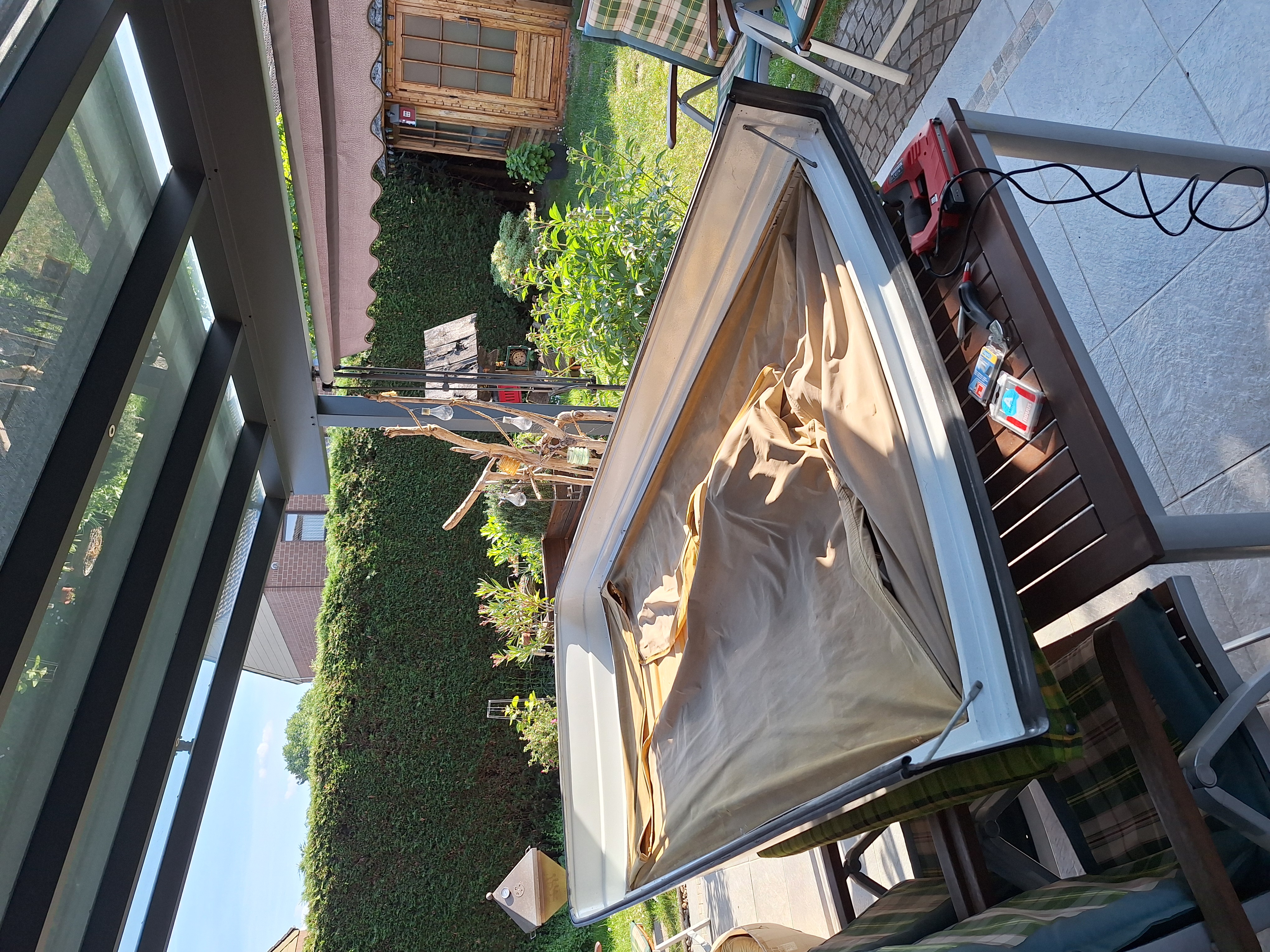 Dieses Frühjahr ist dann der Stoff so morsch geworden, dass er beim Aufstellen über die gesamte Frontfläche gerissen ist. Allerdings war der Stoff immer noch gut gesapnnt und konnte zumindest als Muster und Maßstab für den neuen Faltenbalg dienen.