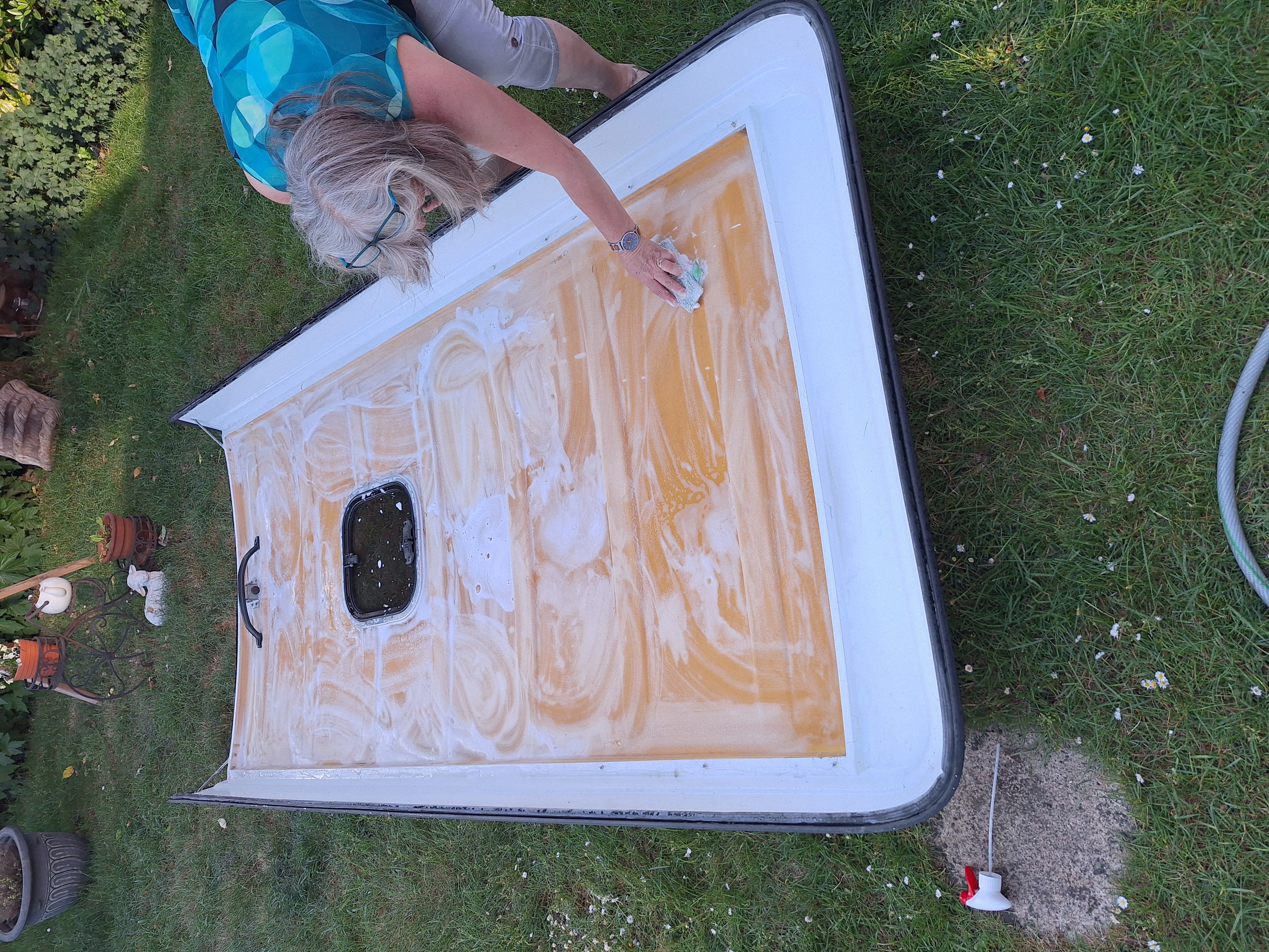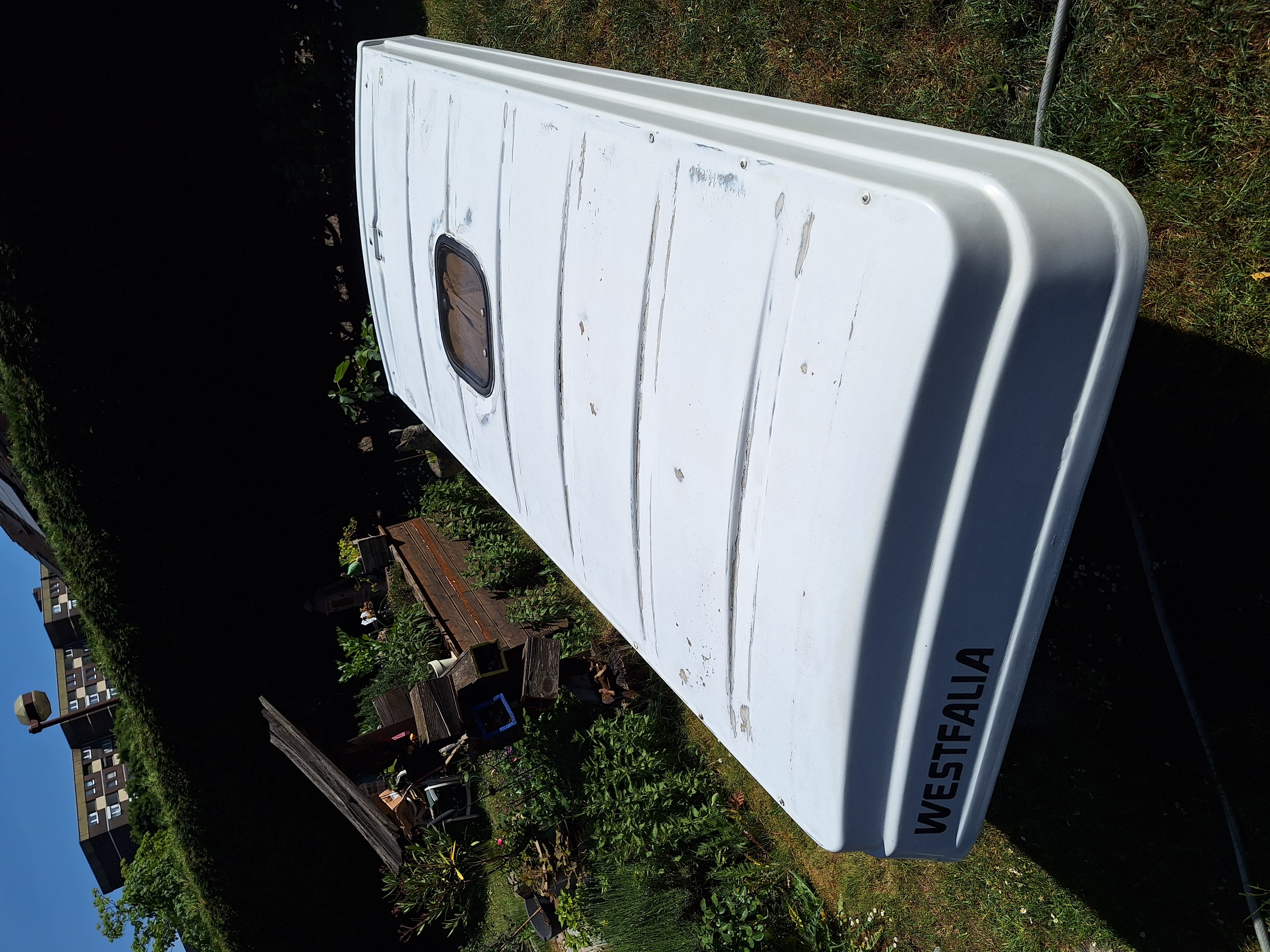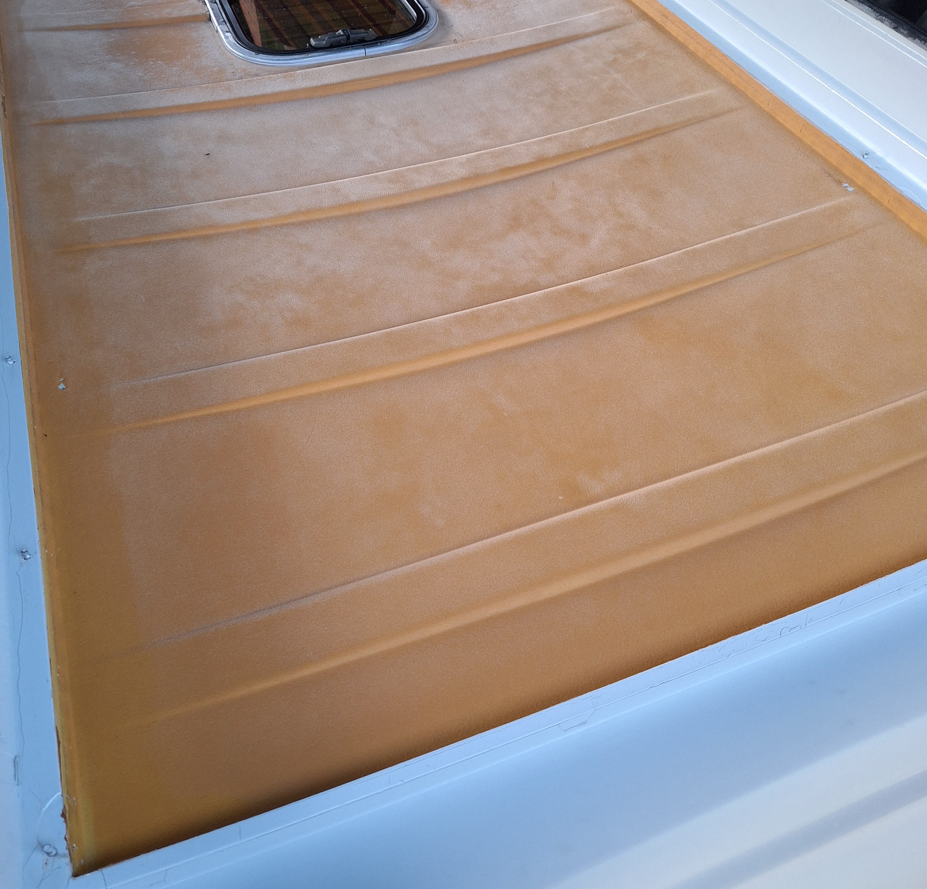 Damit war das Dach von innen schon wieder schick. Wenn schon denn schon, also auch von außen mal mit dem Exzenterschleifer die schlimmsten Stellen übergeschliffen und mit Bootslack und einer Rolle lackiert.