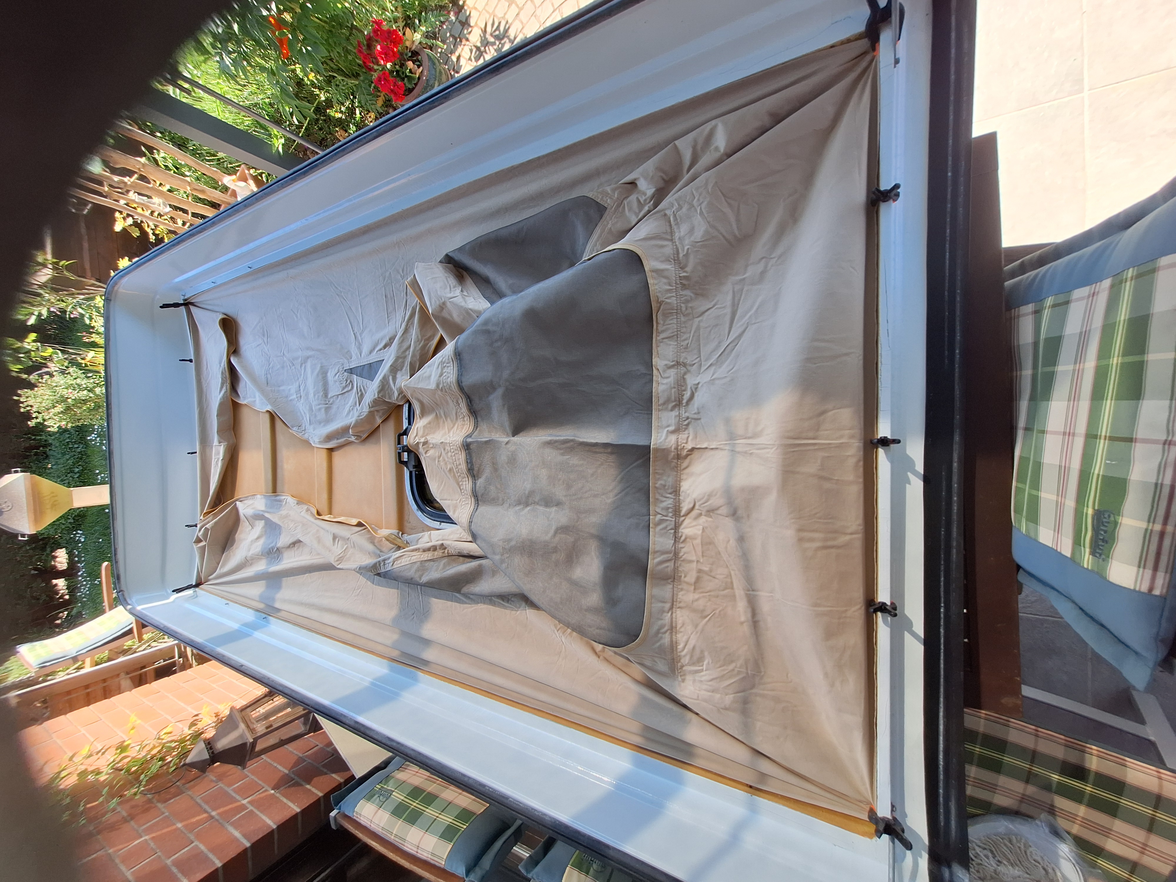 sieht schonmal nicht völlig daneben aus, aber jetzt kommt es drauf an, haben wir richtig gemessen und alle vernünftig angetackert? Das Hubdach habe wir etwa 2/3 geöffnet und nach vorne in die Gepäckwanne abgestützt.