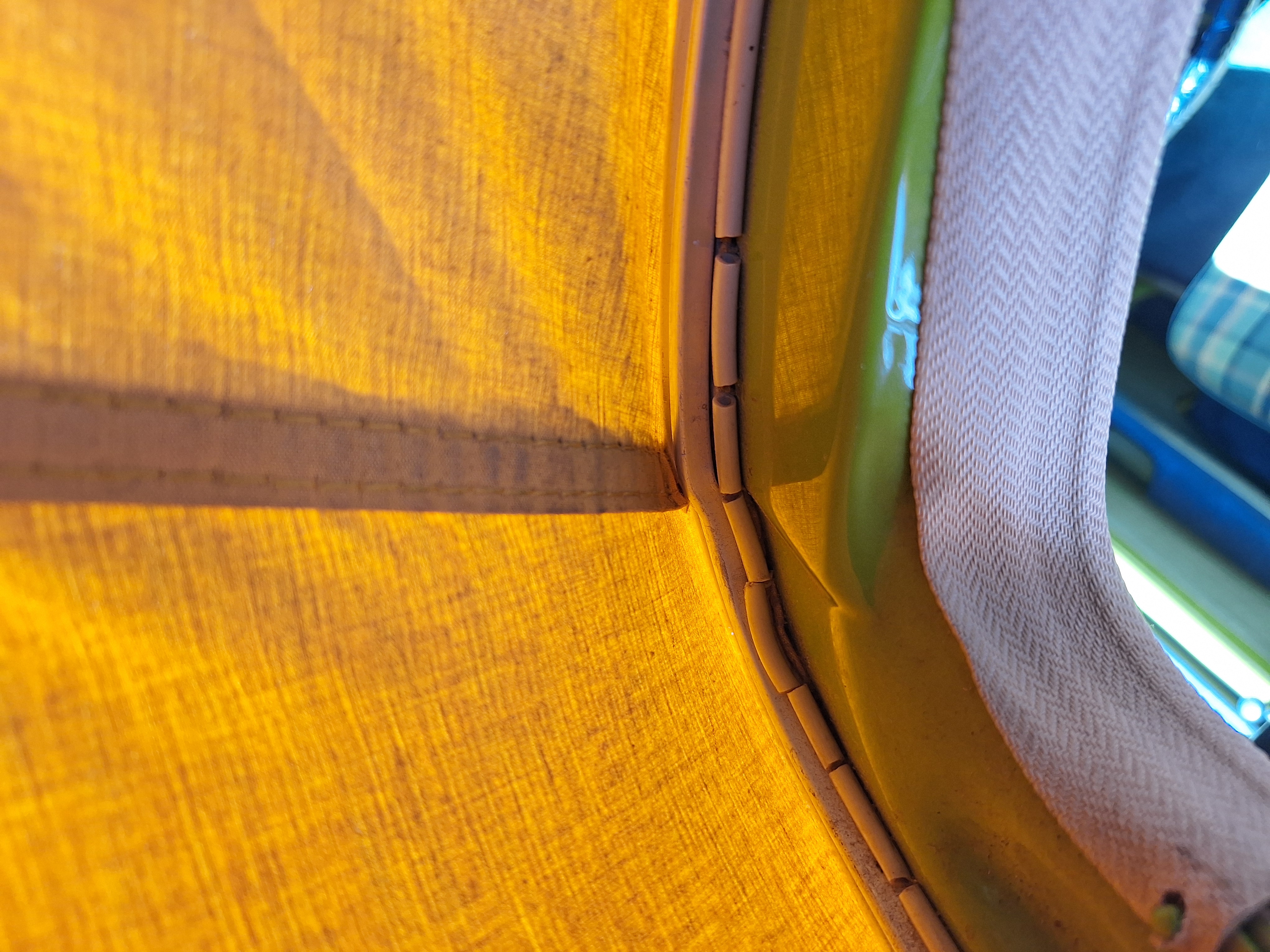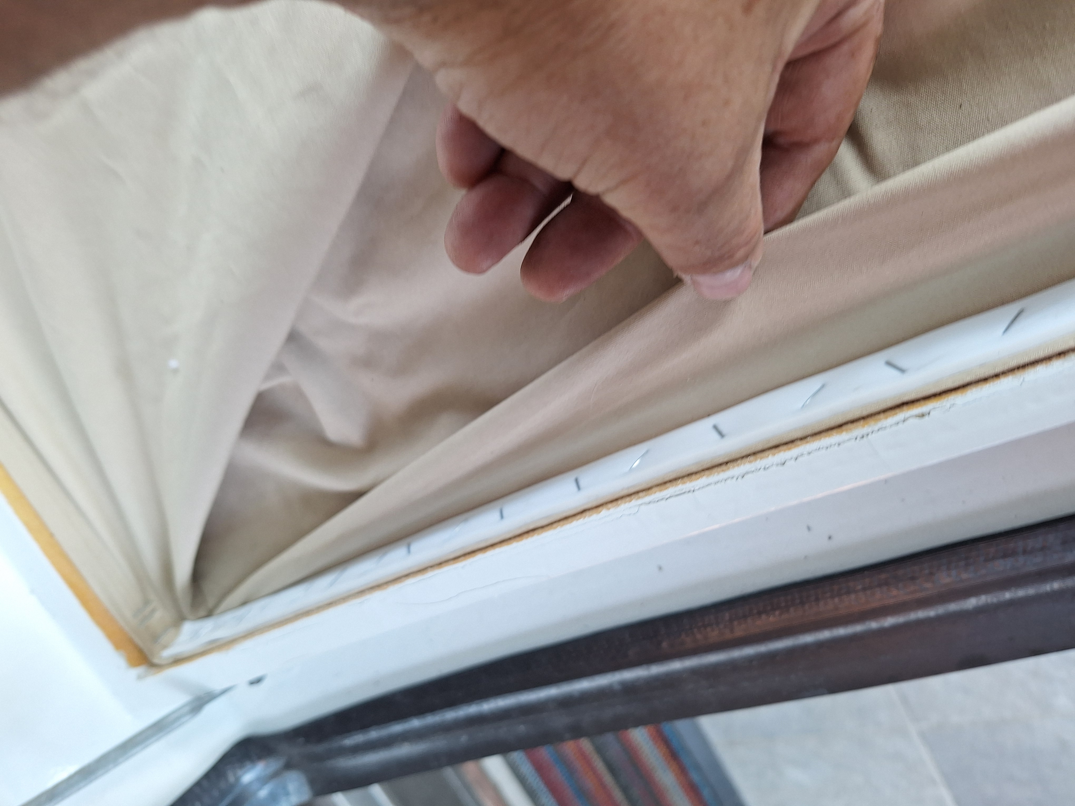 Begonnen haben wir mit der vorderen Leiste und den Stoff zuerst in der Mitte befestigt. Dann die Schräubchen immer im Wechsel mal links, mal rechts eingeschraubt. Dabei haben wir den Stoff immer leicht auf Spannung gehalten. Nachdem die Leiste fest war haben den Keder auf etwa 10cm im Bereich der Naht eingeschnitten um den besser um die Ecke zu legen. Das war im Original auch so.