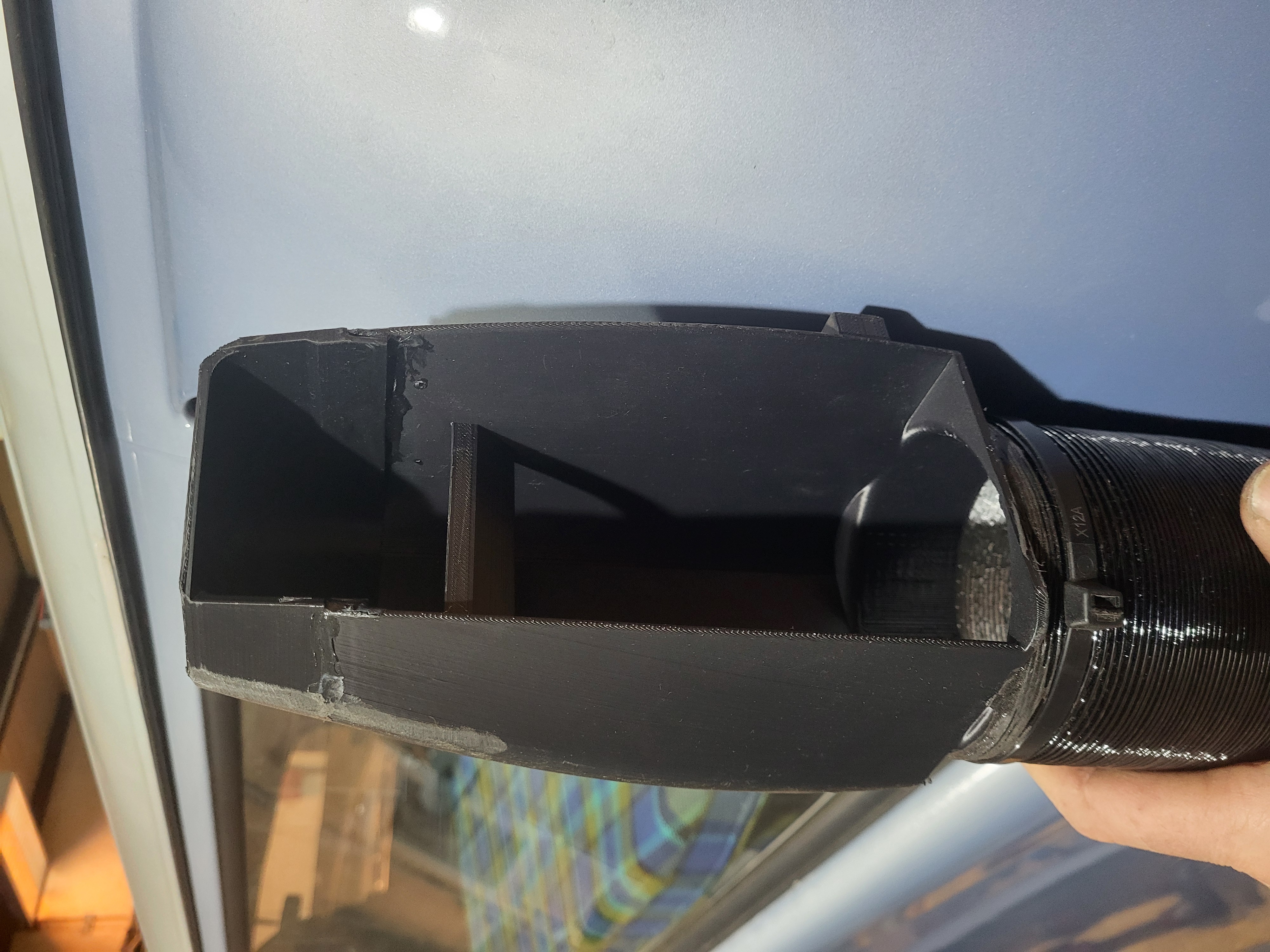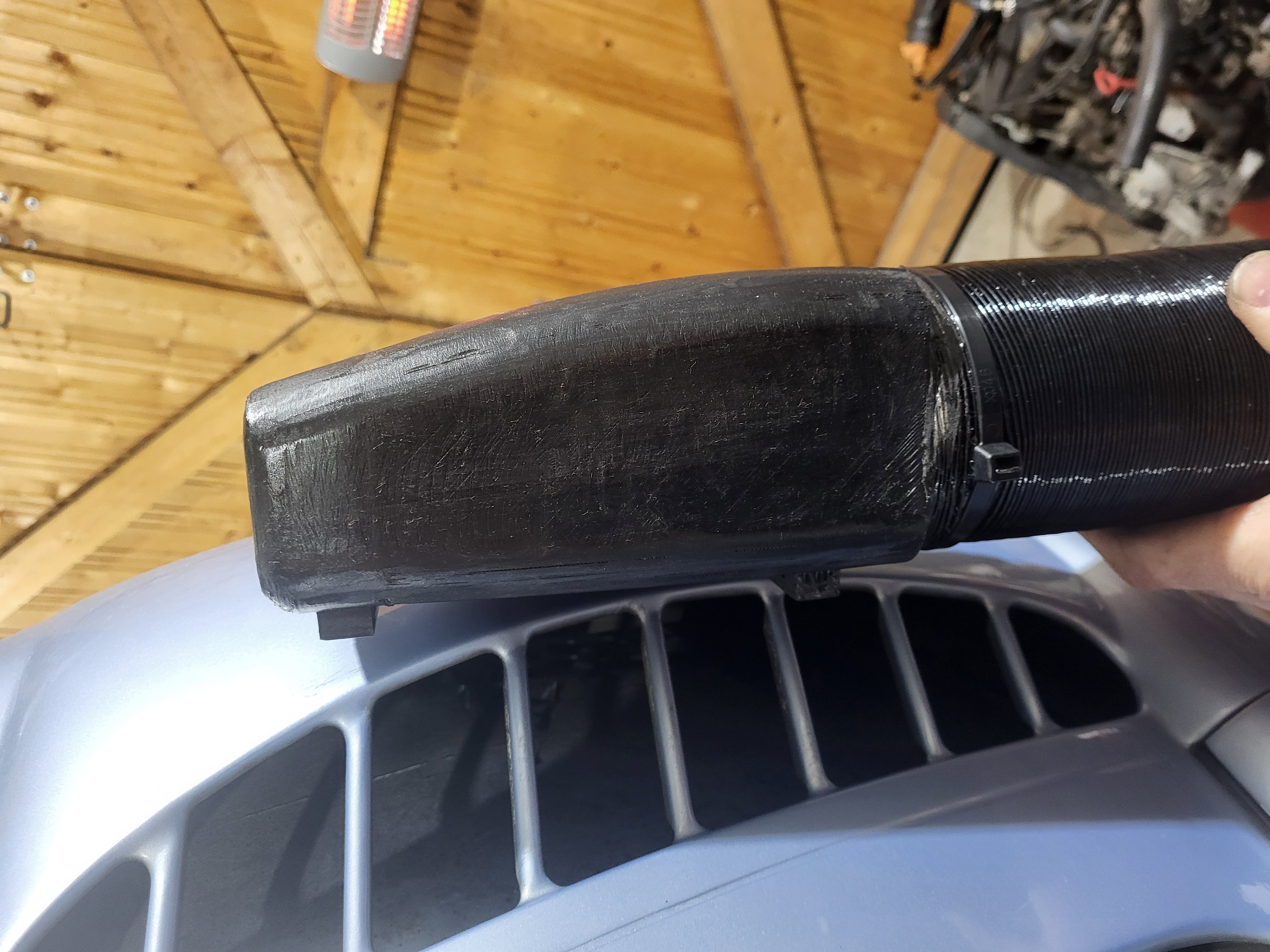 Auch die Ansaugung habe ich geändert, jetzt holt der Motor sich wie beim T3 die Luft direkt oben aus der Backe, mittels Schnorchel (Öffnung nach hinten). Das könnte auch für andere Fremdmotorfahrer interessant sein wenn ein Kühler im Motorraum steht. Das Teil ist aus ASA gedruckt, ebenso der Adapter an der Drosselklappe.