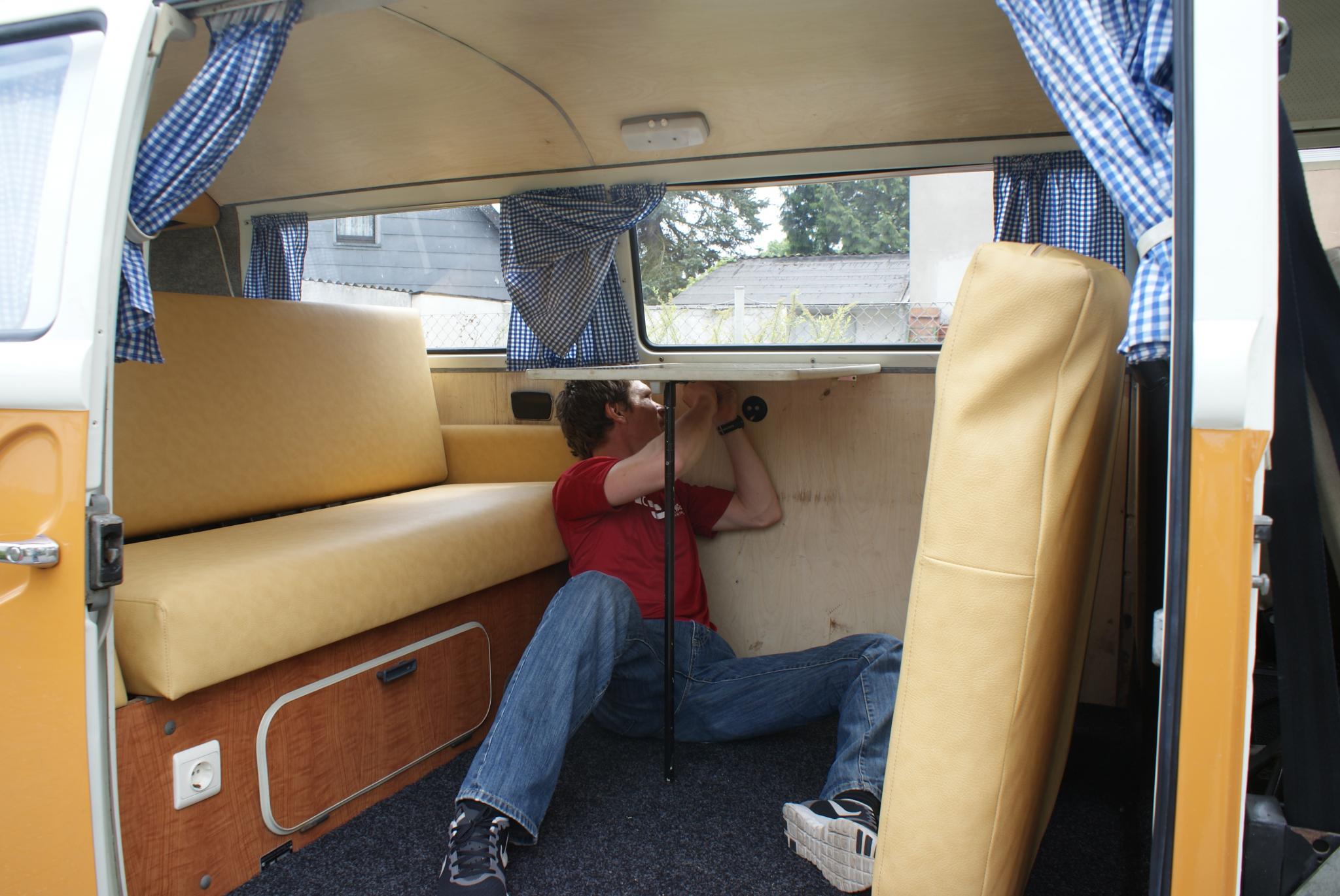 So die neuen Polster sind drin und sehen sau gut aus, man beachte die "Ohren" der ausgeflickten Vordersitze und dazu noch einen "stylischen" (orginal?) T2-Tisch aus bugnet.de!