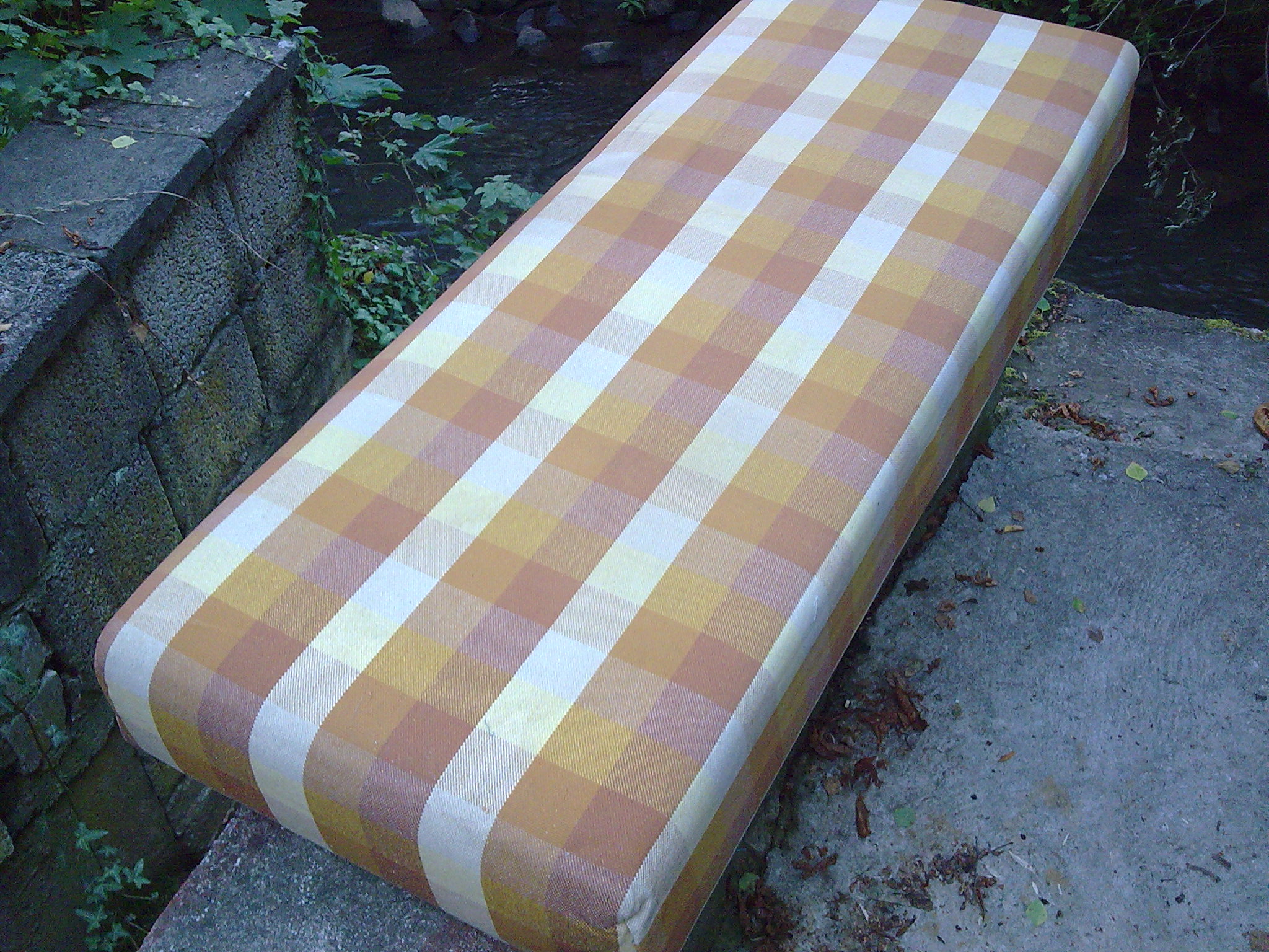 Heute dann die Lehne der Klappbank zwecks Breitenanpassung abgezogen und dabei unter 3 Lagen Stoff (die oberste einst sogar von mir selbst angebracht) folgendes gut erhalten vorgefunden:
