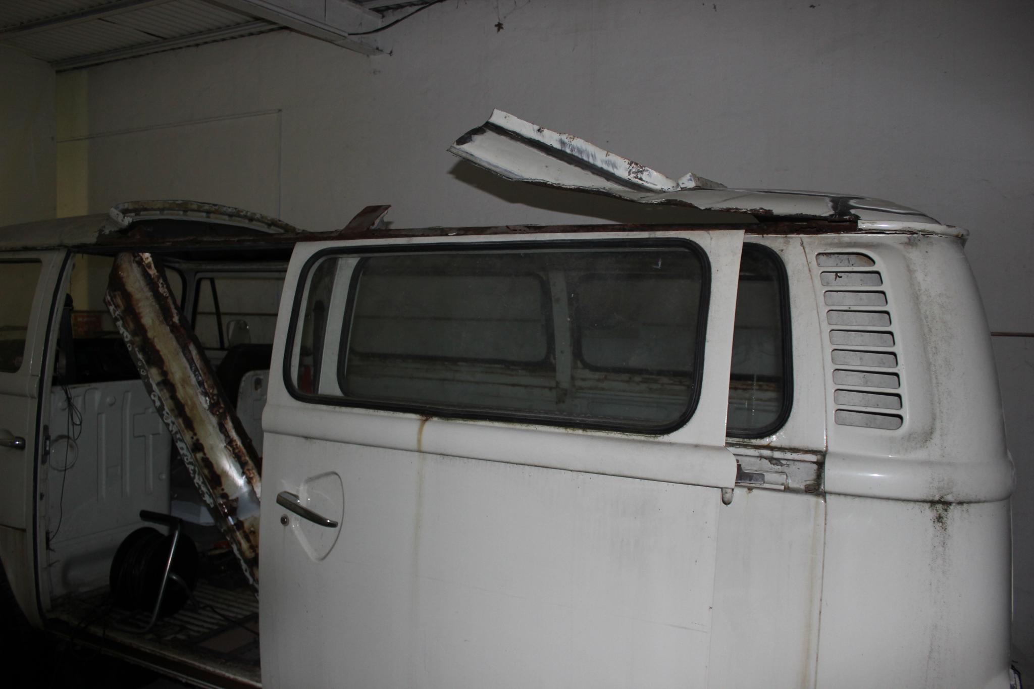 Angefangen, das Dach abzunehmen. Eine Sch... Arbeit. Ich kann die originalen Schweißpunkte nicht sehen, weil über die gesamte Länge Bleche drübergepunktet wurden. Also alles von Hand mit Hammer und Meißel... :wall: