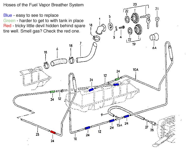 Beim volltanken steigt das Benzin hoch in die Entlüftungseinheit. Du sollest daher die Schläuche ( 24 ) prüfen und austauschen.