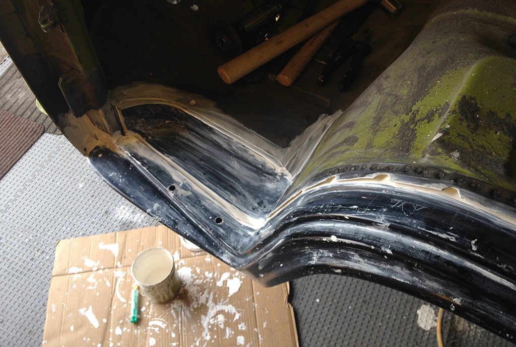 Bei der Gelegenheit wurden die Gummimatten unter den Sitzen erneuert und Rost am Fahrerhausboden gesucht, zum Glück nur ganz wenig Rostpickel unter der verklebten Matte gefunden.