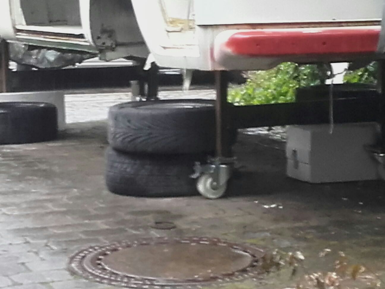Beim Herunterlassen von der Bühne fing es dann auch noch an aus dem Loch unterm Helsinkikühlschrank, also hinterm Beifahrersitz, rauszusuppen. Und nicht wenig.