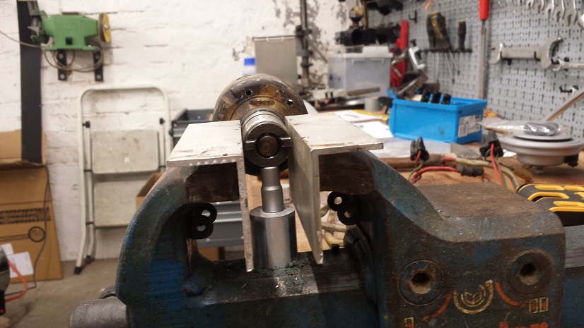 P.S.: Achtung beim letzten Bild. So kannst du dir den Aluschaft des Verteilergehäuses zerkratzen, wenn sich das etwas verdrehen sollte. Klemm' den Verteiler am besten hochkant direkt mit den kleinen Nocken am Mitnehmer in den Bock. So kannst du den Bolzen mit einem schieren Dorn und dosierten Hammerschlägen schonender austreiben. Die Nocken halten das aus.