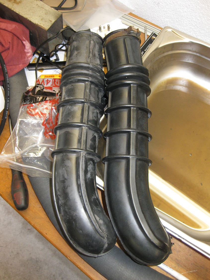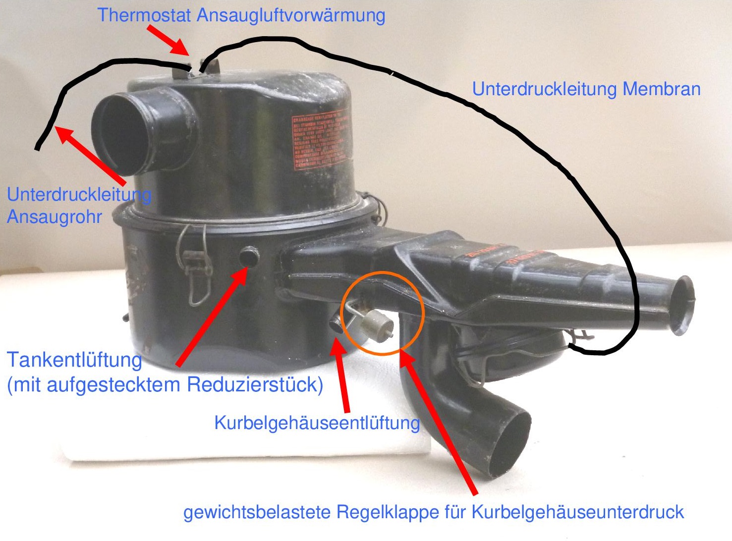 MIt nem Zündkerzengummi und Schraube hab ich zum einen den unnützen Stutzen am Gebläsekasten verschlossen und auch einenam Luftfilter. Da der Ansaugschnorchel rissig war, hab ich den auch getauscht. Gegen ein NOS-Teil, allerdings wohl aus Südamerika, denn die Trennstellen sind nicht wie beim Original und ich musste auch Material an den Positionen der Schellen entfernen und innen (quasi entgraten) So siehts nun aus. Ganz neu auch erstmals mit Schlauch für die Ansaugluftvorwärmung. Jetzt muss ich nur noch testen, dass der Thermostat auch umschaltet, sodass die Unterdruckklappe die Kaltluft freigibt.