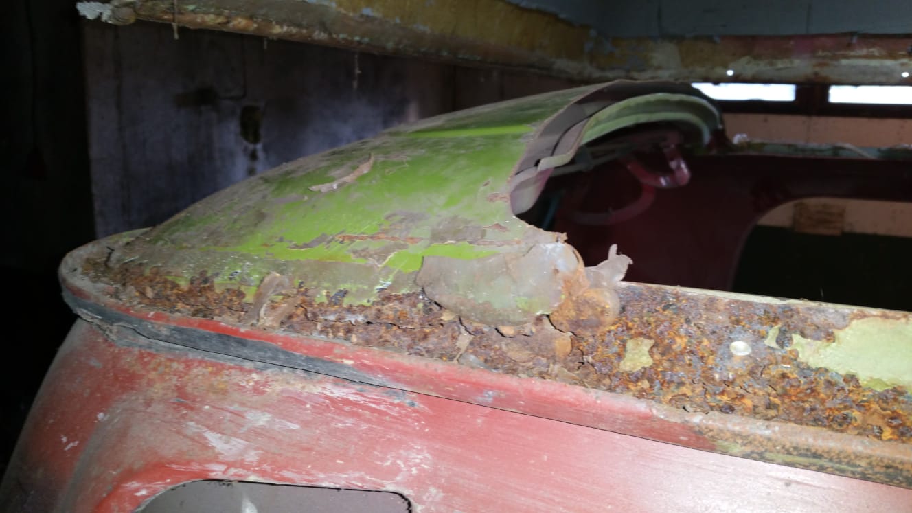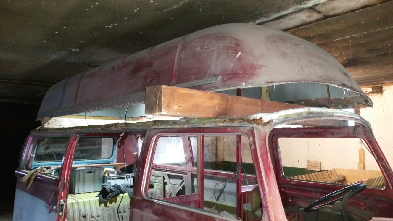 Mein Plan ist, das Dach nach VW-Vorgaben mittels eingeschweißten Blechstreifen zu verbördeln. Zum Glück ist die dafür vorgesehene Kante am GFK noch vollständig vorhanden. Den Dachrahmen werde ich wieder rekonstruieren und vieleicht sogar einen Teil der Dachhaut einsetzen und mit dem Rahmen verschweißen. Ähnlich dem Dachrahmen des späten Westfalia. Das sollte nochmal etwas mehr Stabilität ergeben, auch wenn es vom Korrosionsschutz eher ungünstig ist. Der originale Verstärkungsrahmen im Dach ist vorhanden und wird natürlich wieder verschweißt. Ich überlege aber noch je links und rechts auf halber Höhe einen zusätzlichen Träger zwischen die Säulen zu setzen um dem Ganzen mehr Verwindsungssteifigkeit zu geben.