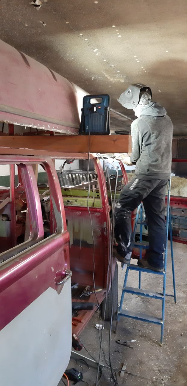 ich habe am Sonntag noch etwas am Hochdach gearbeitet und einen weiteren Teil des Dachrahmens über der Beifahrertür erneuert. Zum Glück habe ich jetzt ein Streck-Stauchgerät, damit kann man die leichte Rundung vorne sehr gut in die Bleche einarbeiten.