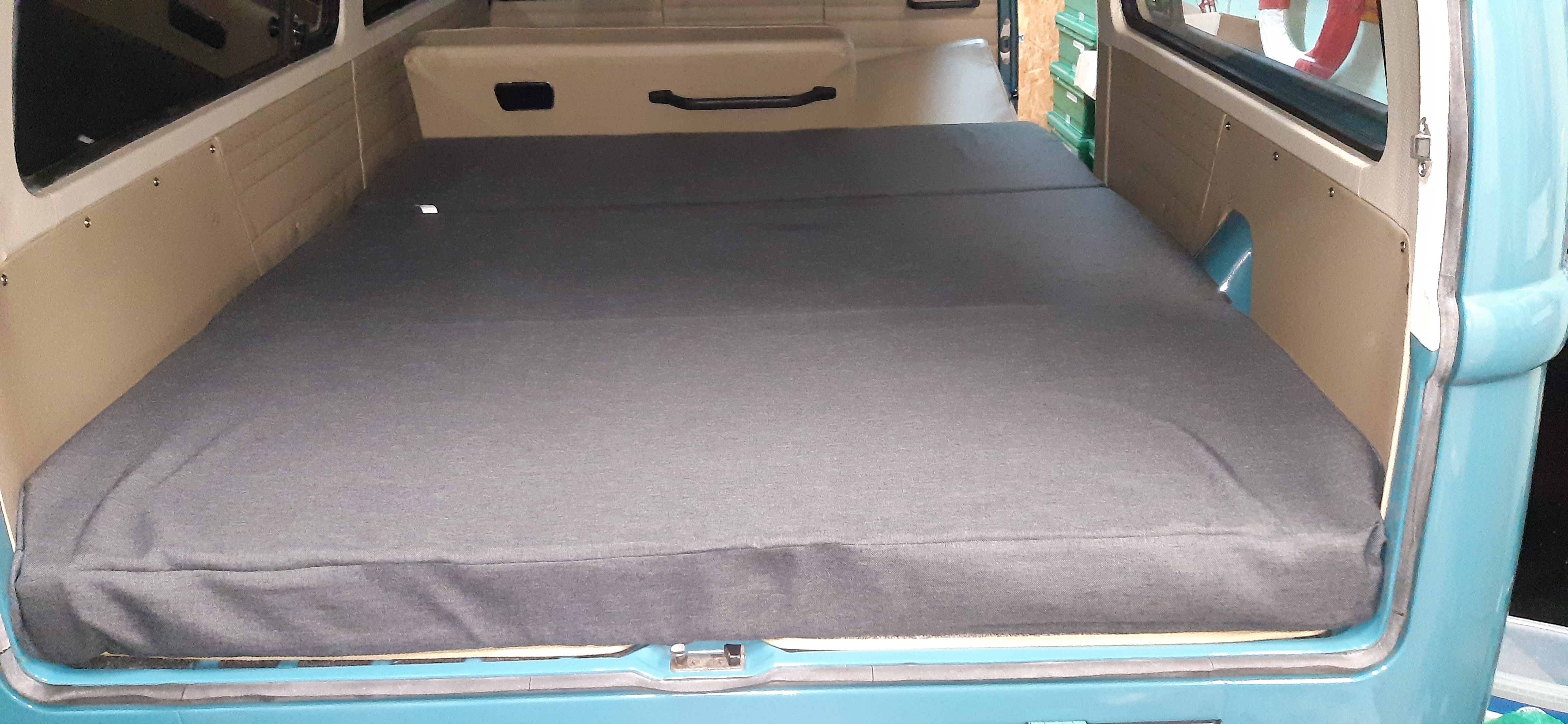 Jetzt noch die Klappmatratze, angepasst auf die Gegebenheiten, deswegen der leicht labberige Bezug.
