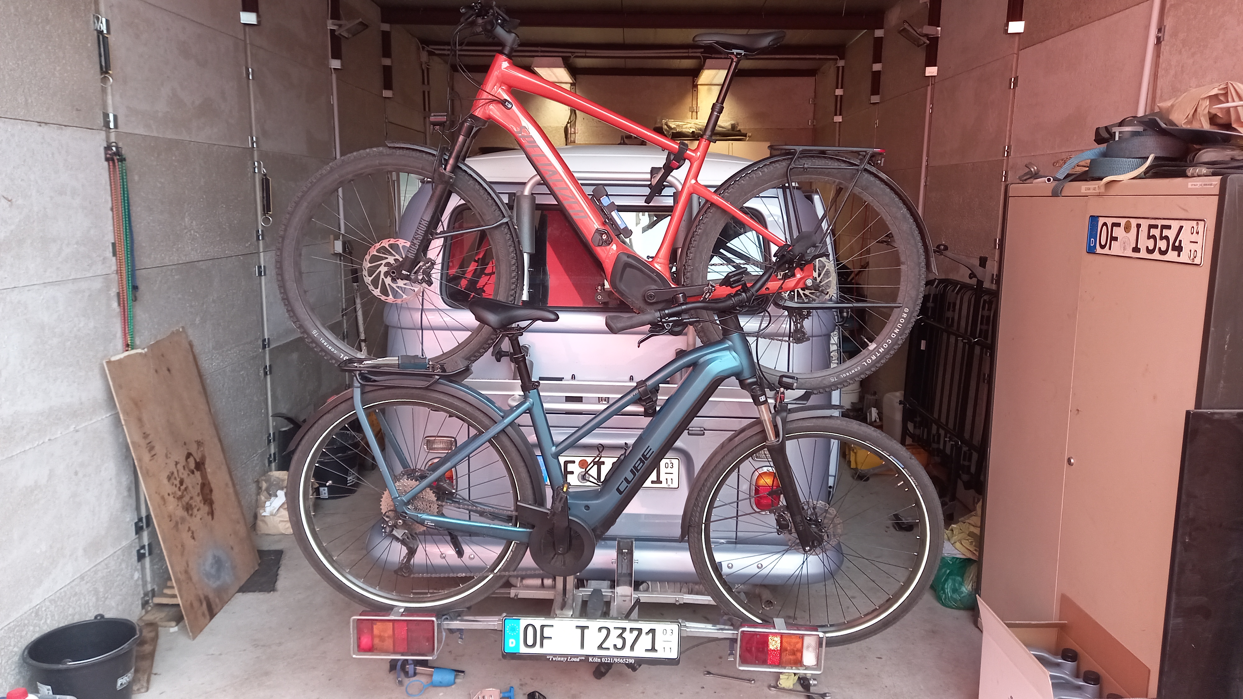 Und jetzt geht's los mit Planung wie wir alles für die Wochen diesmal ohne Wohnwagen unter bekommen. Die e Bikes (ohne Unterstützung ziehe ich den inzwischen etwas fußlahmen Vierbeiner nicht im Anhänger) wiegen zuviel um beide auf einen Träger zu bekommen, da muss eins an die Heckklappe und eines auf die Hängerkupplung. Das sieht schon etwas heftig aus...