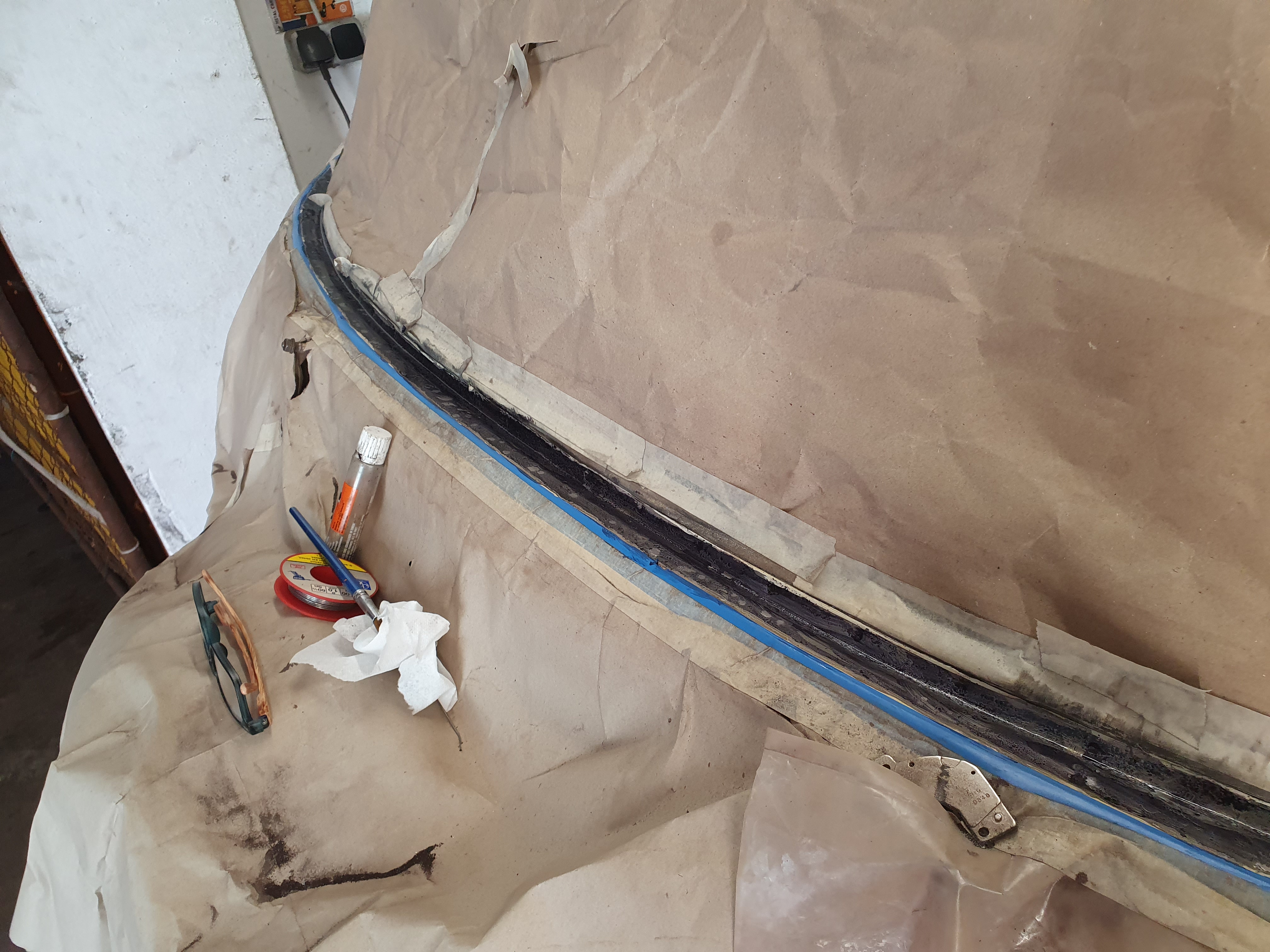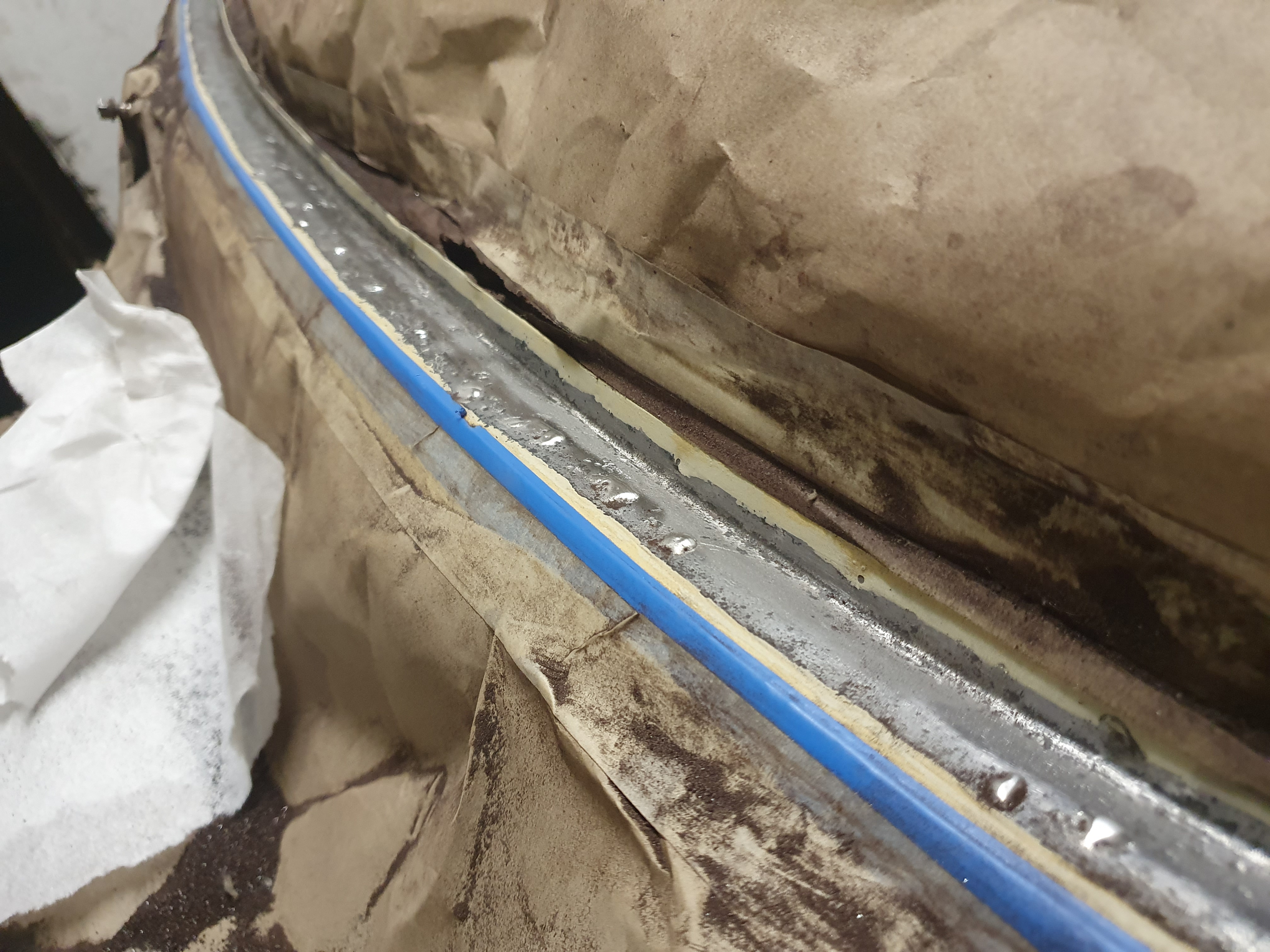 Nach Beendigung von Sandstrahlen, Schleifen und Rostnarben mit dem Diamantschleifer auf dem Dremel habe ich das ganze mit Brunox Epoxy eingepinselt und nach 5 Stunden mit Silikonentferner wieder entfernt.