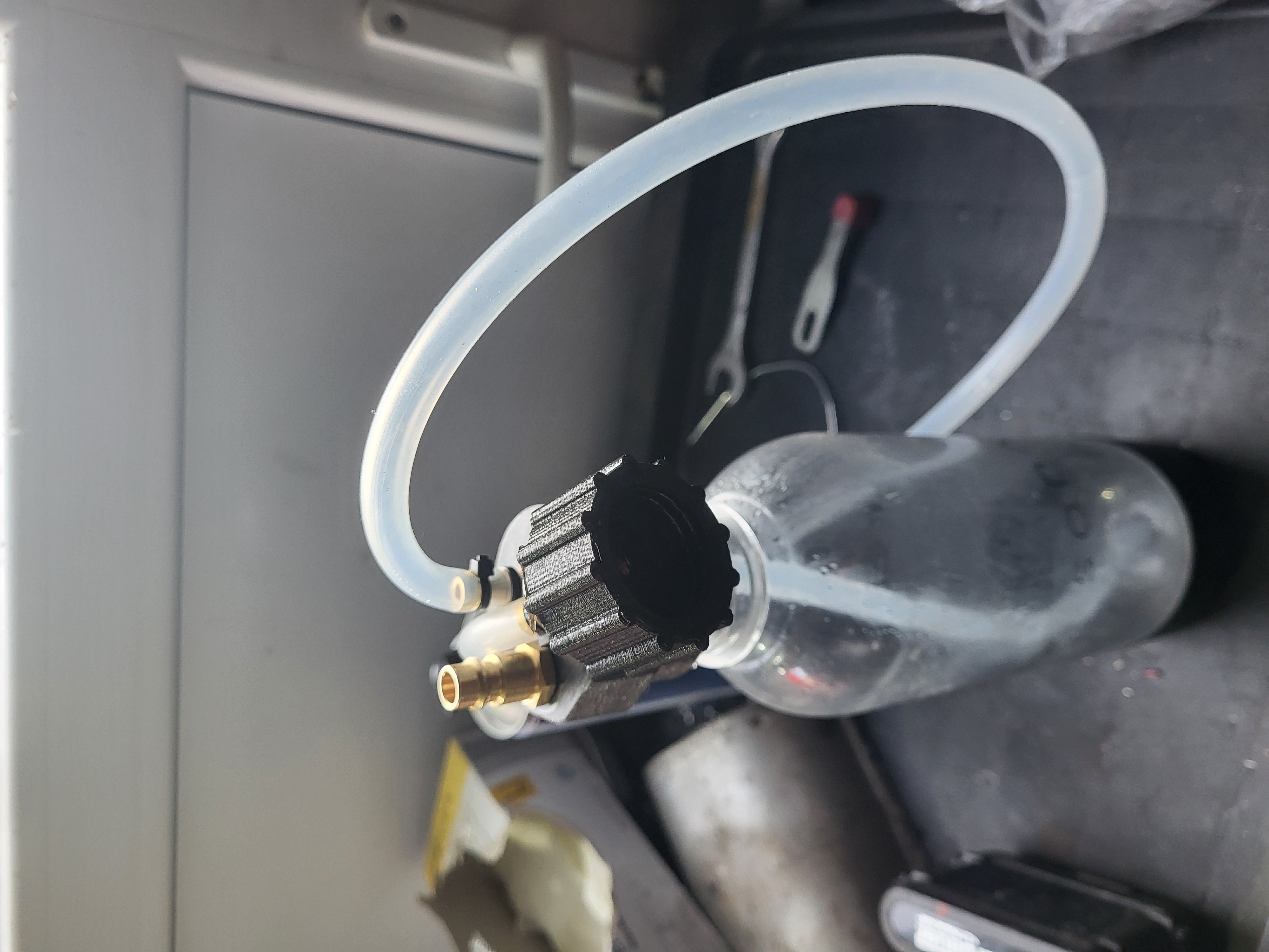 Neuen Deckel dafür gedruckt, aus PTFE das angeblich gegen Bremsflüssigkeit recht resistent ist. Mit Bohrungen und Gewinde für Schlauchtülle innen und außen, sowie für einen Druckluftanschluss.