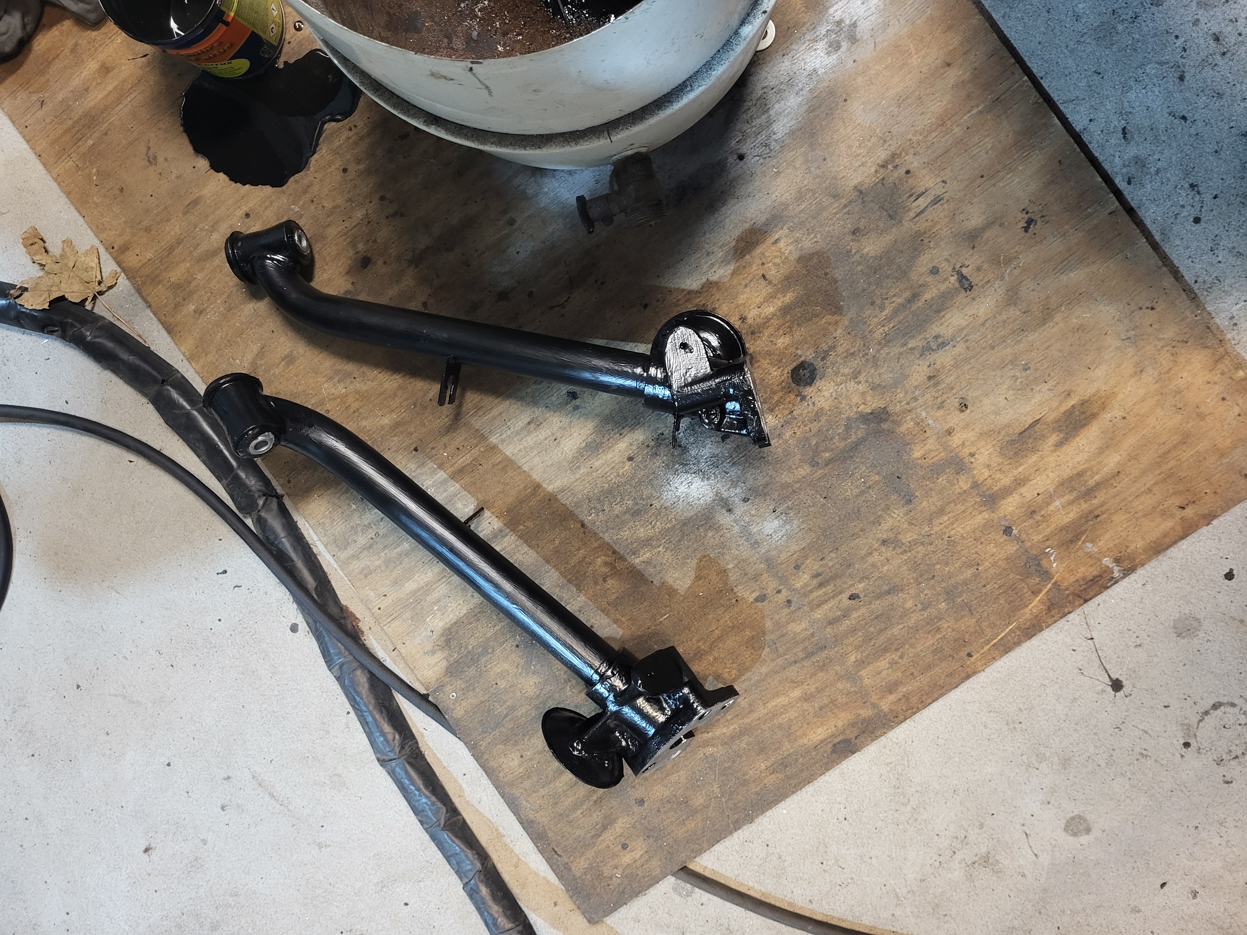 Schräglenker und Radlagergehäuse sandgestrahlt und mit Brantho lackiert, die Schräglenker dabei auch innen mit Rostschutz geflutet.