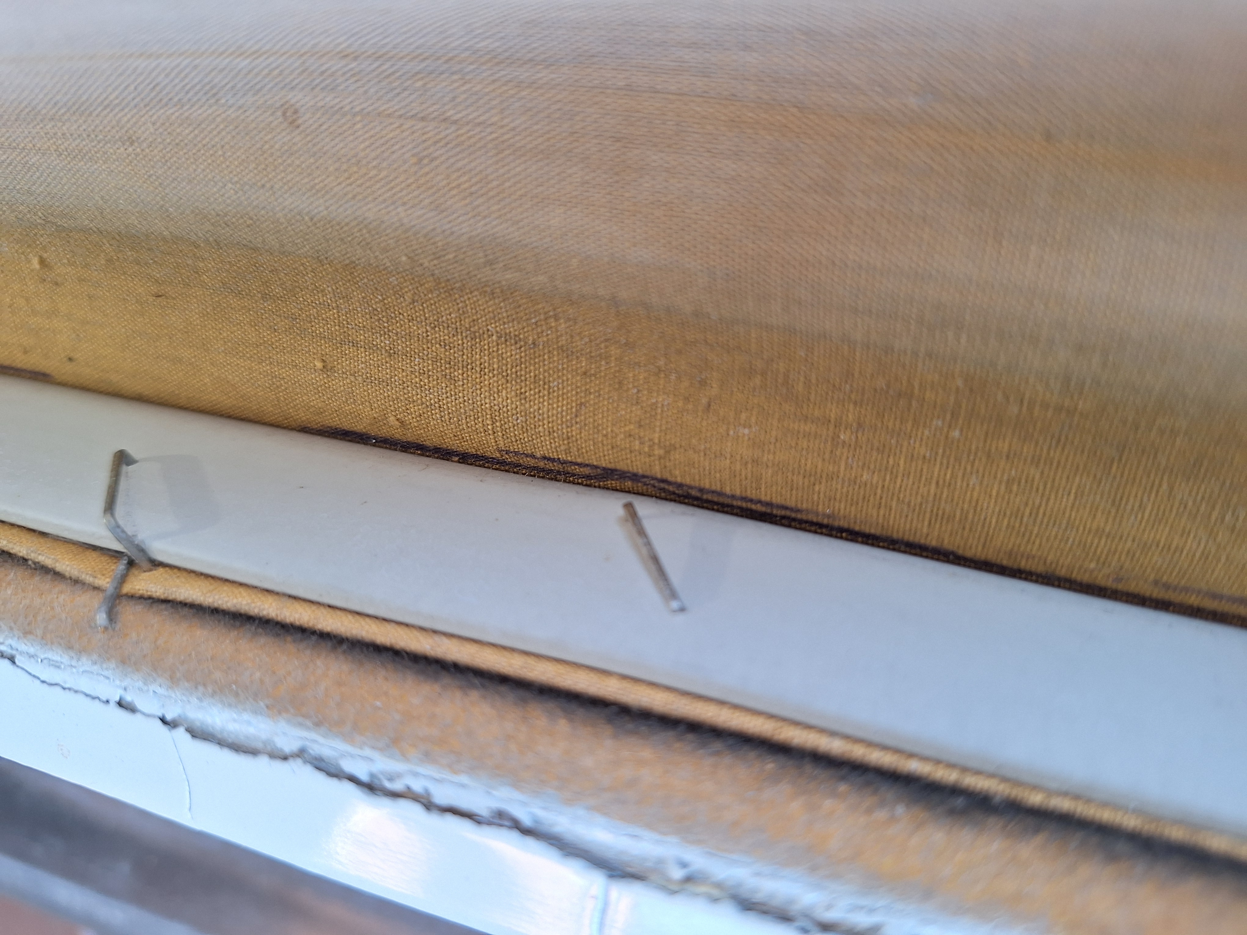 zunächst mit Federklemmen vorne und hinten fixiert. Die Ecken passten glücklicherweise problemlos und ohne große Spannung. Im Anschluss dann mit einigen Tackernadeln (11 x 14) den Stoff an unseren 8 Messpunkten fixiert und so ca. alle 6 - 8 cm mit einer Tackernadel fixiert. Danach dann das Flachband zurechtgeschnitten und angetackert. Hier darf man in den Ecken ruhig reichlich Nadeln setzen, auf der restlichen Fläche habe ich dann so ca. alle 3 cm eine Nadel getackert. Nicht vergessen das für Aufstellgestänge noch links und rechts die seitlichen Löcher durch das Flachband und das Tuch gebohrt werden müssen sonst bekommt man später die Schrauben nicht mehr durchgesteckt.