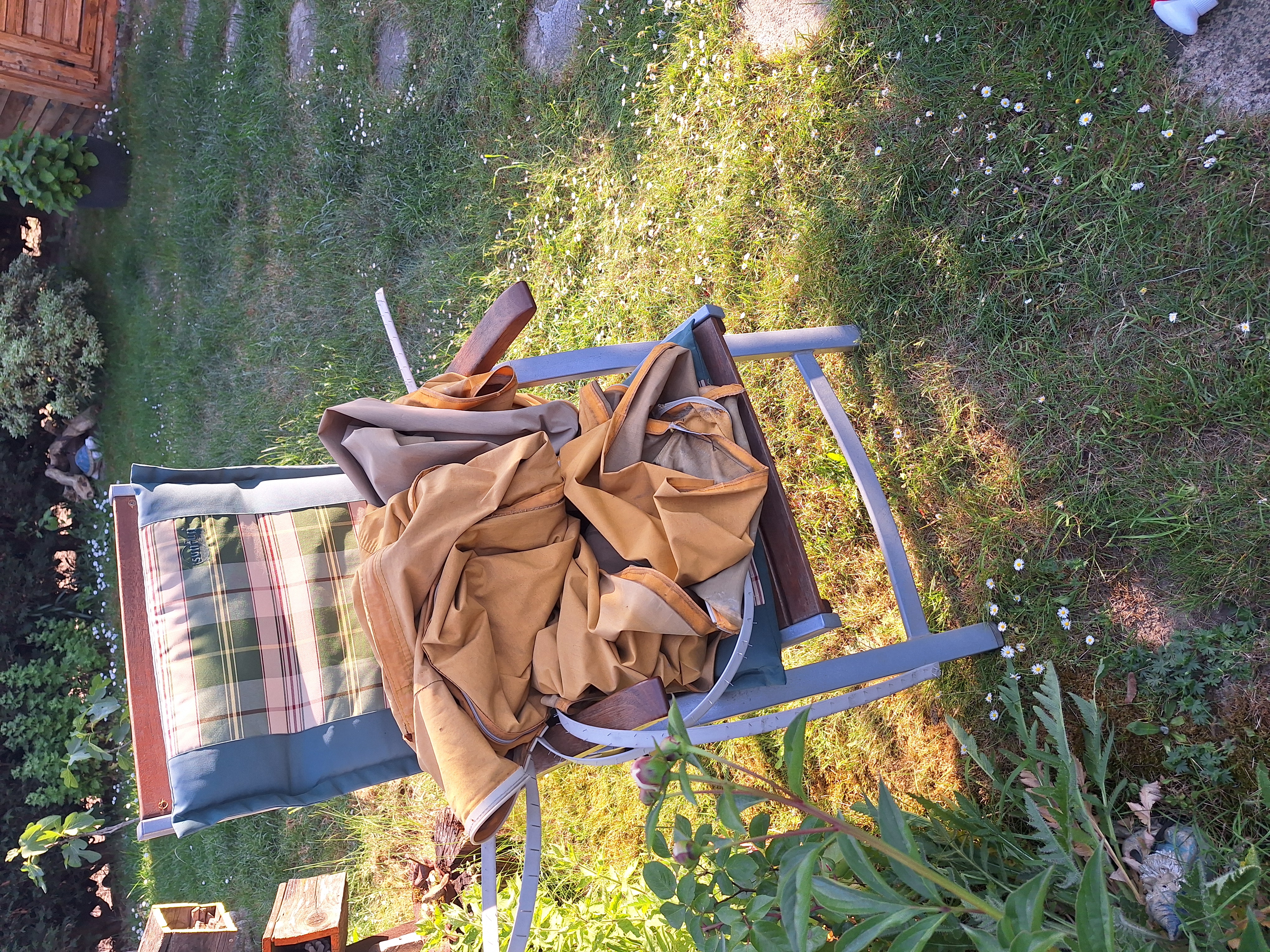 habe diese Woche nach langem hin und her entschieden, das Dachzelt unseres Bulli zu selbst wechseln. Wir hatten noch das originale Zelt der Auslieferung verbaut und mittlerweile war der Stoff völlig ausgeblichen, sehr fleckig mit deutlichen Stockflecken in den Ecken und etlichen kleinen und größeren Löchern . Dieses Frühjahr ist dann der Stoff so morsch geworden, dass er beim Aufstellen über die gesamte Frontfläche gerissen ist. Allerdings war der Stoff immer noch gut gesapnnt und konnte zumindest als Muster und Maßstab für den neuen Faltenbalg dienen. Also musste das Dach erst mal runter vom Bus. Bevor wir den alten Zeltstoff entfernten, haben wir an jeder Ecke und vorne, hinten, links und rechts jeweils in der Mitte der Stoffbahn Markierungen angebracht um die Maße später auf das neue Zelt zu übertragen. Jetzt konnte der alte Kram raus un in den Müll. Auch die Beflockung hatte schon deutlich gelitten und war mit Stockflecken durchsetzt. Mit viel Wasser und Schimmel-Ex war das schnell erledigt. Damit war das Dach von innen schon wieder schick. Wenn schon denn schon, also auch von außen mal mit dem Exzenterschleifer die schlimmsten Stellen übergeschliffen und mit Bootslack und einer Rolle lackiert. 2 Schichten Lack hat das Dach jetzt auf der Terrasse bekommen, den dritten Durchgang gibt es wenn das Dach wieder auf dem Bus ist.