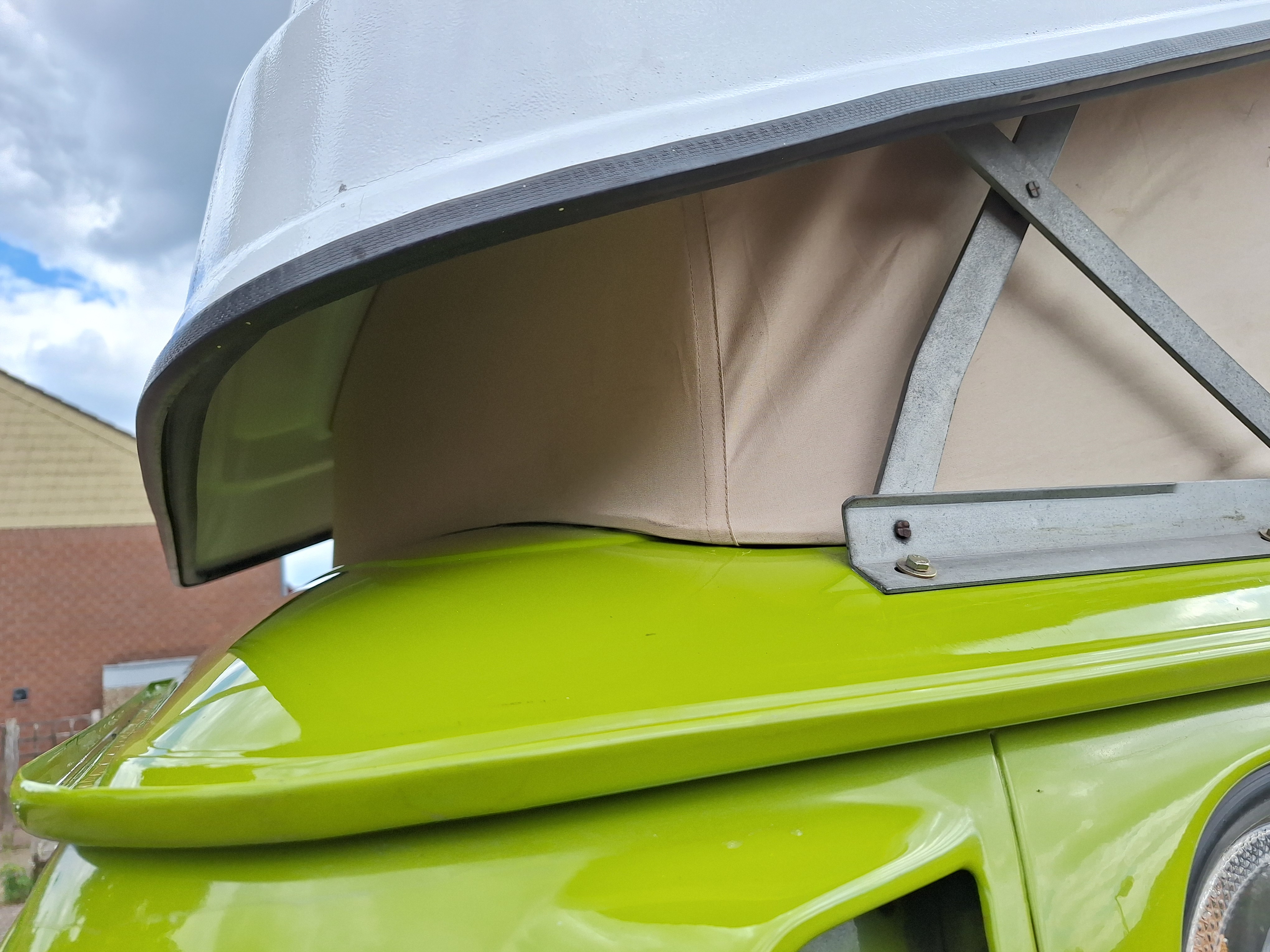 Jetzt war das Dach bereit für den Einbau . Die Muttern wieder hinten auf die Scharniere zu bekommen war ein bisschen fummelig, aber letztendlich haben wir es Dank tatkräftiger Hilfe hinbekommen. sieht schonmal nicht völlig daneben aus, aber jetzt kommt es drauf an, haben wir richtig gemessen und alle vernünftig angetackert? Das Hubdach habe wir etwa 2/3 geöffnet und nach vorne in die Gepäckwanne abgestützt. Begonnen haben wir mit der vorderen Leiste und den Stoff zuerst in der Mitte befestigt. Dann die Schräubchen immer im Wechsel mal links, mal rechts eingeschraubt. Dabei haben wir den Stoff immer leicht auf Spannung gehalten. Nachdem die Leiste fest war haben den Keder auf etwa 10cm im Bereich der Naht eingeschnitten um den besser um die Ecke zu legen. Das war im Original auch so. Jetzt ging es im Wechsel mit den langen Leisten links und rechts weiter. Nach etwa der Hälfte des Daches wollte ich es wissen ob der Stoff zu stramm oder zu labrig ist. Also einmal mutig sein und gaaaanz vorsichtig die Aufstellstange hochdrücken. Mit ein wenig Knacks und Knirsch ging der Aufsteller in die Endposition. Über das Ergebnis war ich dann erstmal total happy. Der Rest lief dann fast wie von selbst, lustig wird es dann nur noch die Schräubchen in die hinteren Ecken zu bekommen. Aber mit Geduld und Spucke klappt das dann auch irgendwann. Zu guter Letzt fand dann noch das obligatorische Fransenband seine Platz. Fertig!