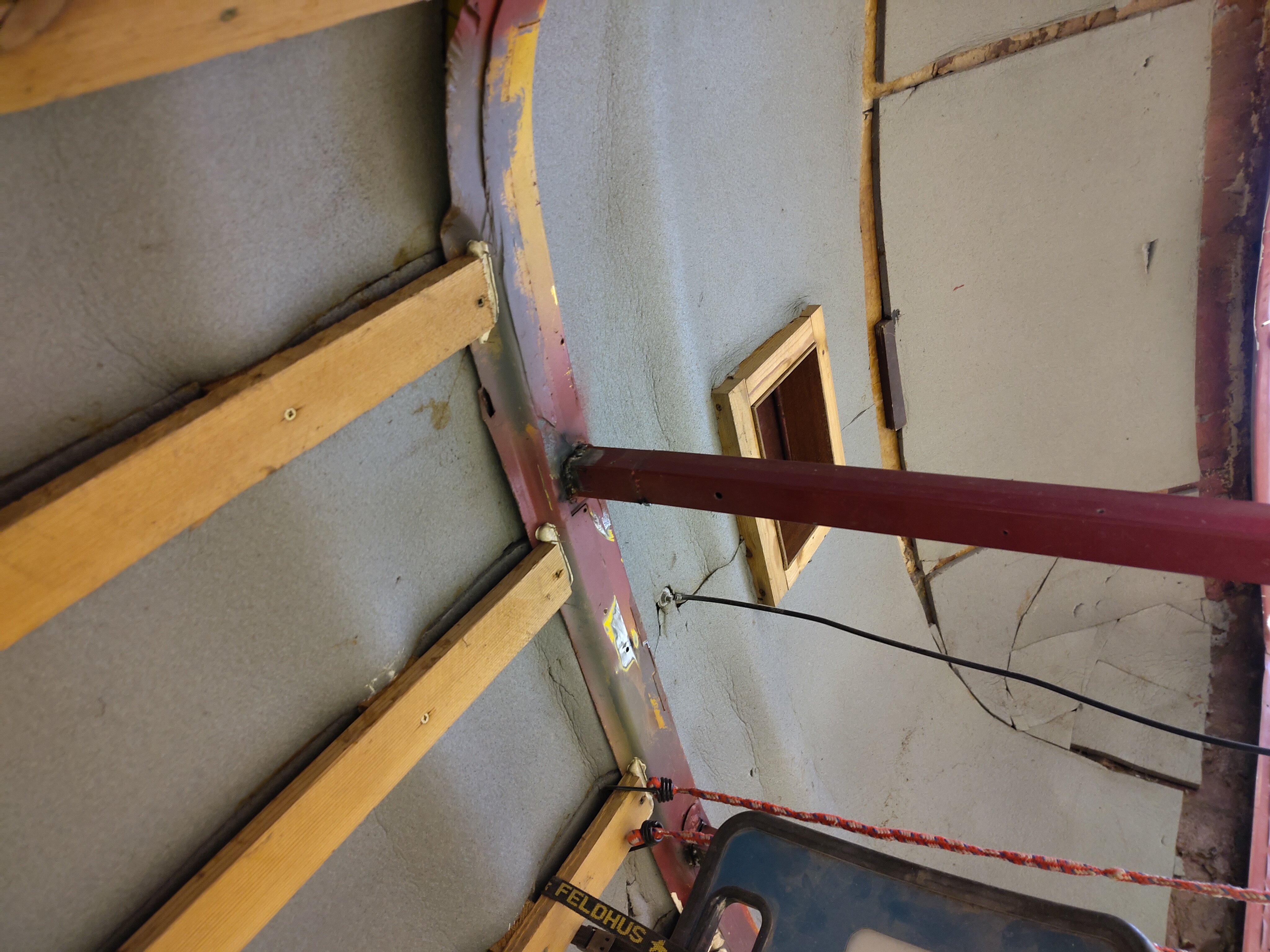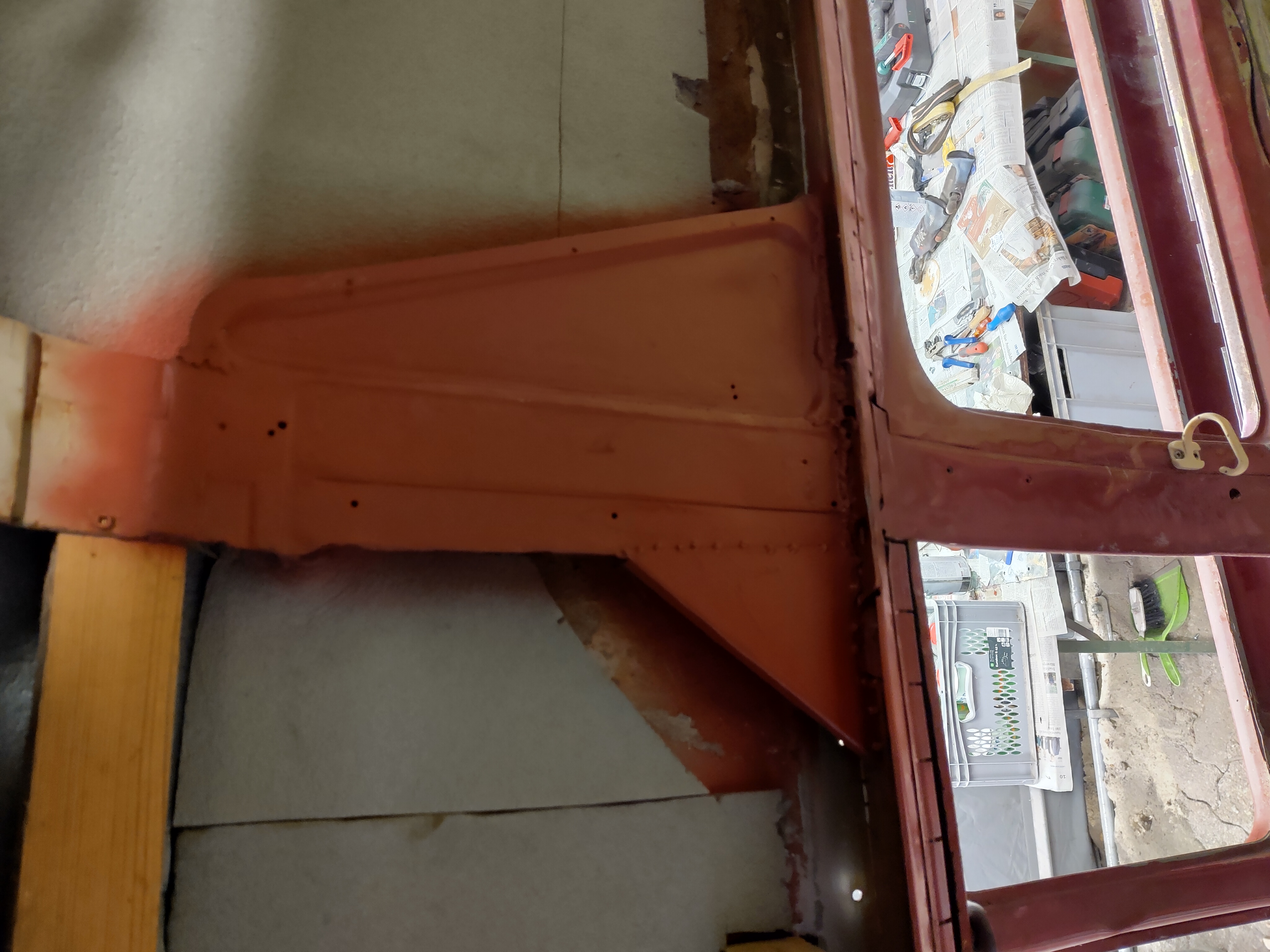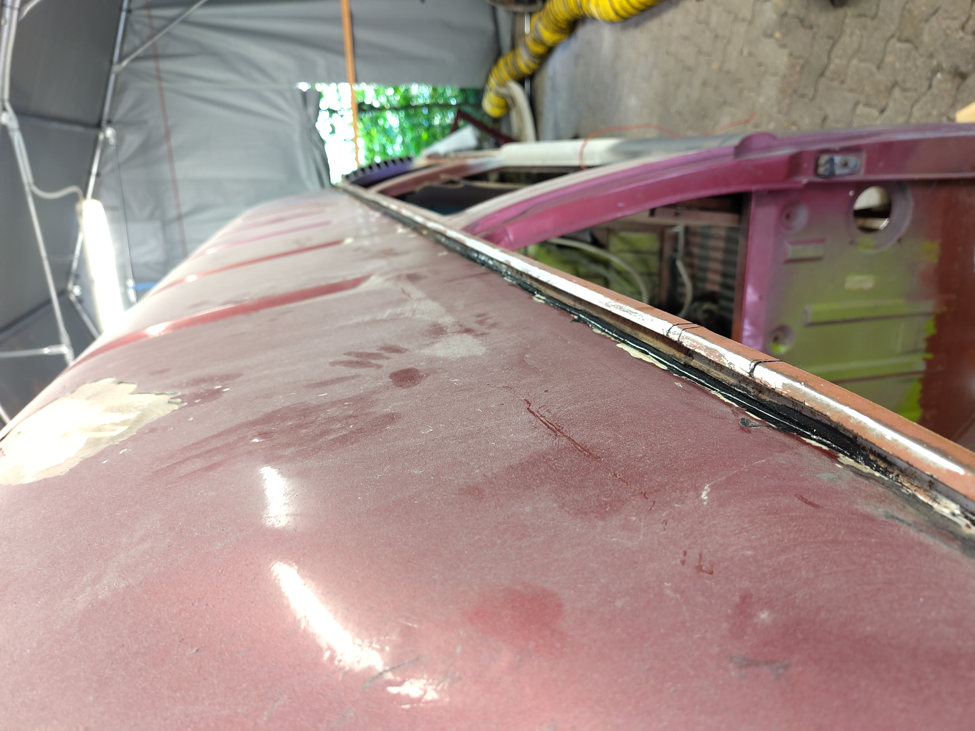 Hochdach ist wieder drauf, rundum verbördelt und abgedichtet. Auch der Rahmen ist wieder verschweißt. Das ist beeindrucken was das an Stabilität ausmacht. Ansonsten schleifen, spachteln, schleifen und mit Karosseriedichtmasse herumsauen. Echt nicht meine Welt das Zeug.