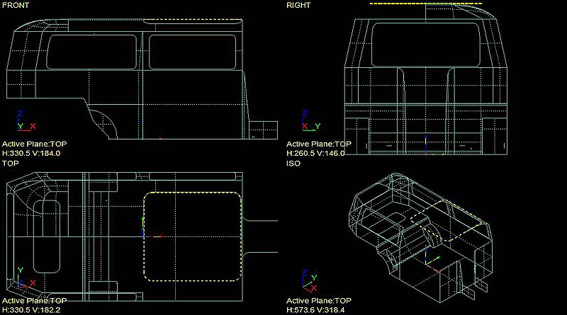Wer über den Winter an einer neuen Einrichtung rumtüftelt und über CAD verfügt, das IGES oder STEP lesen kann, für den habe ich hier mal ein Flächenmodell vom Innenraum(!) hochgeladen. Es ist nicht sonderlich detailliert, die Dachkrümmung ist frei erfunden, Heckklappenmechanik und Tankstutzen etc. fehlen, aber für Layout-Zwecke sollte es allemal ausreichen. Ich habe überall die ungünstigsten Maße genommen (z.B. Innenbreite 1,50m obwohl stellenweise breiter, Fensterdurchbrüche = Größe der Eindrückung etc.).